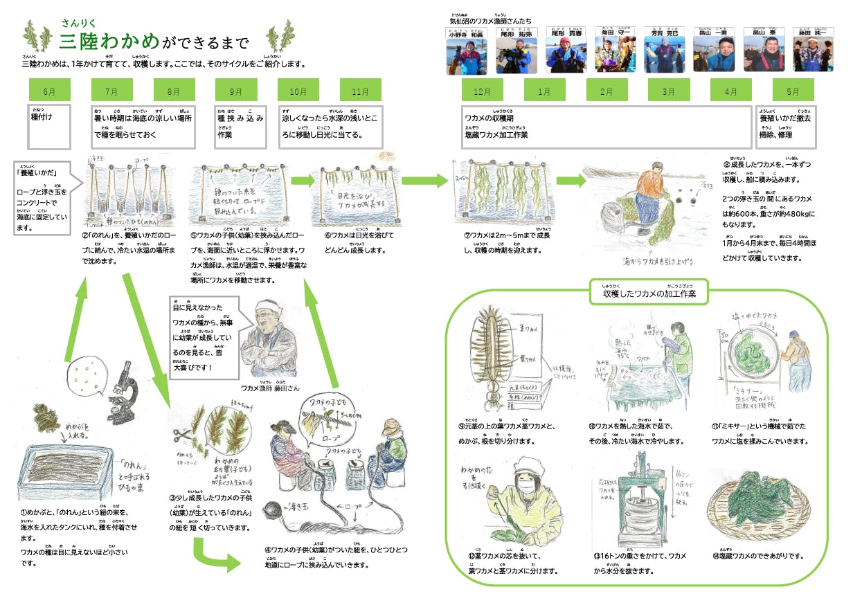 まもなくプロジェクト終了を迎えるにあたり、子どもたちへわかりやすく私たちの仕事を伝えたいと、先日の活動報告でもご紹介したワカメを育てる私たちを描いたイラストをいくつか組み合わせ、冊子(A4両面、2つ折り )を製作しています。