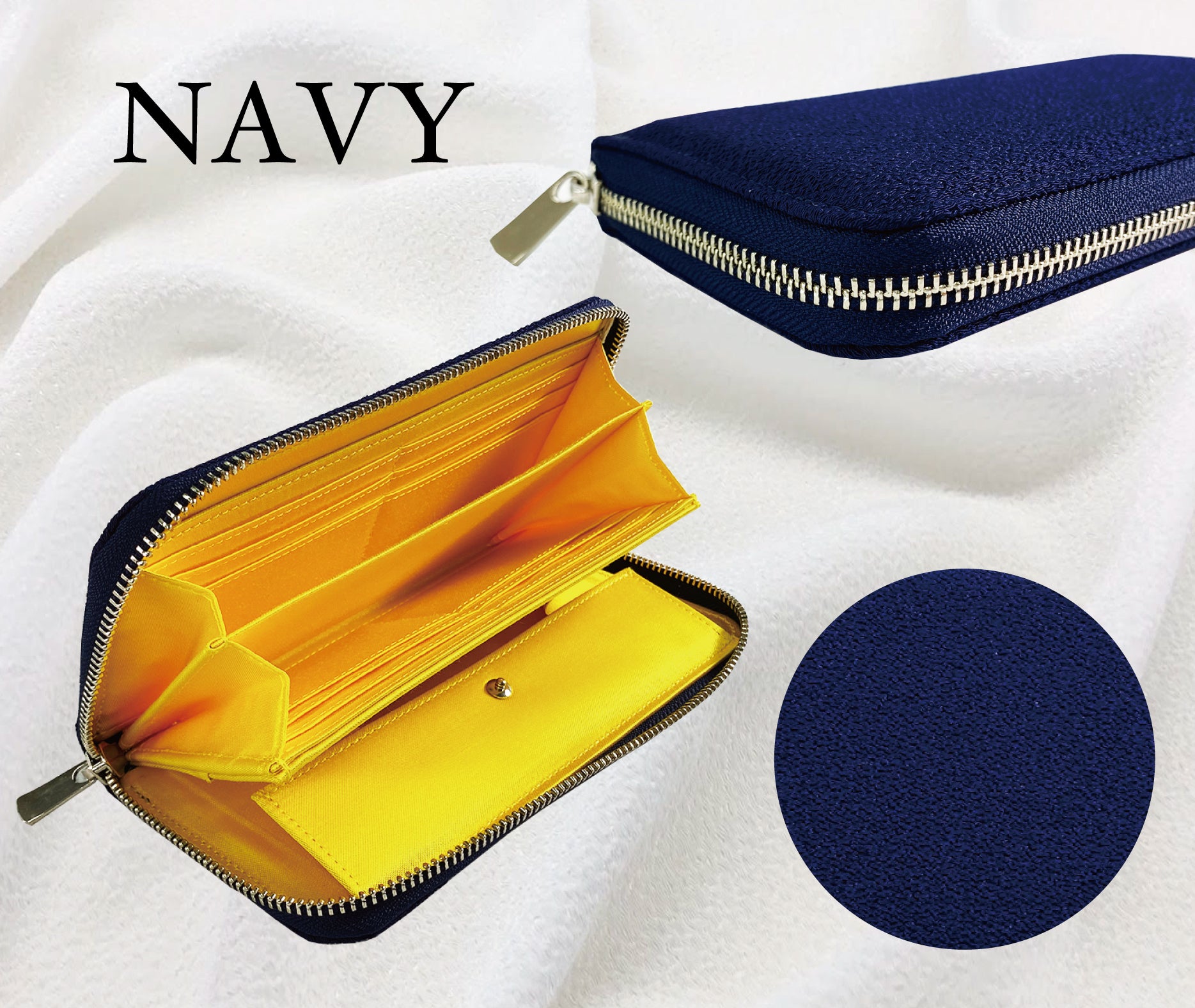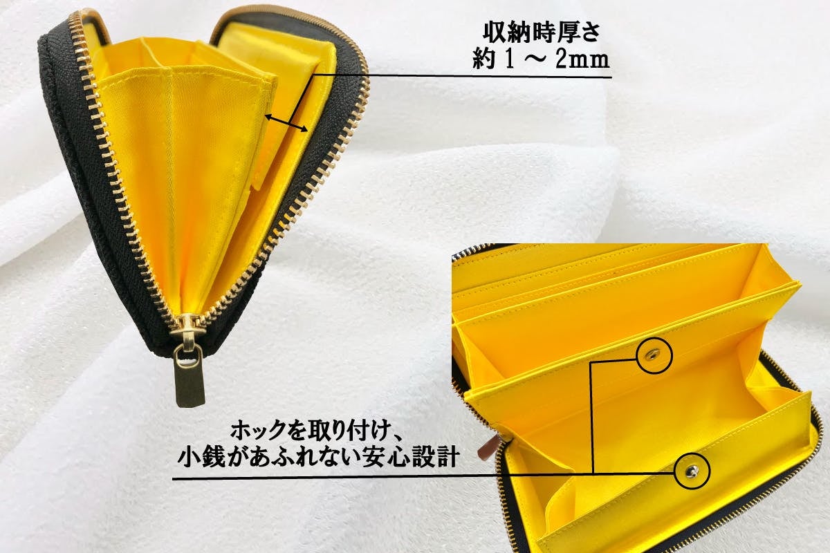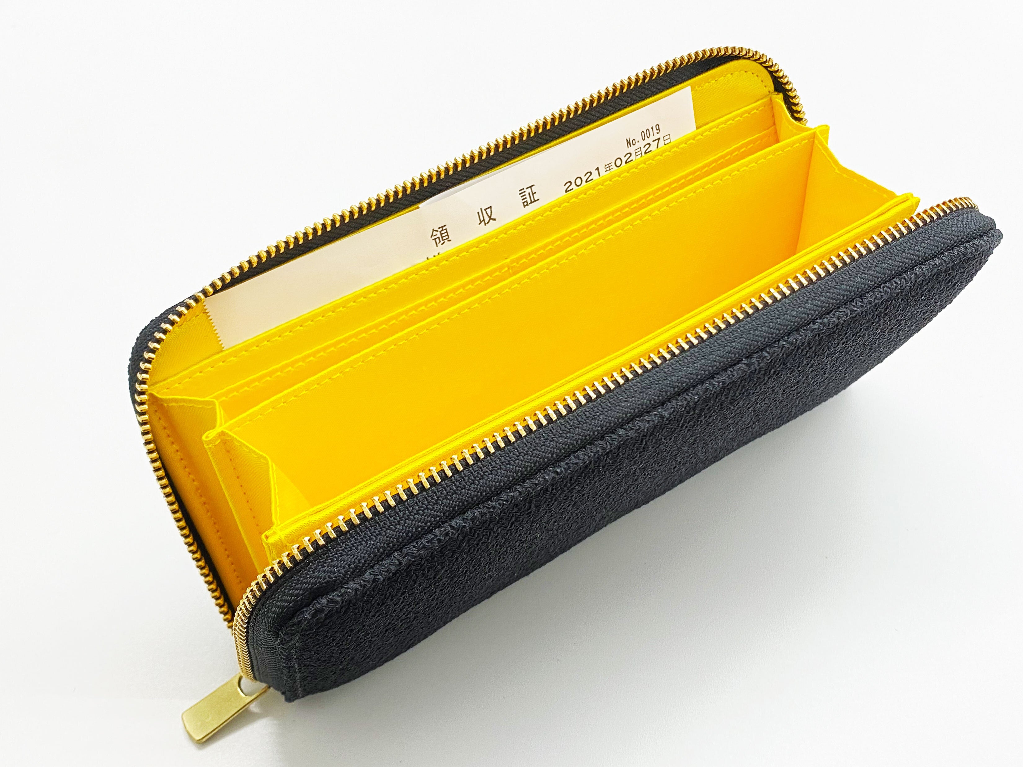 ブラック、ネイビーの2色は落ち着いた外装のため、内装生地にイエローを用いて爽やかさ、視認性を高くし暗い手元でも中身を見やすく仕上げました。