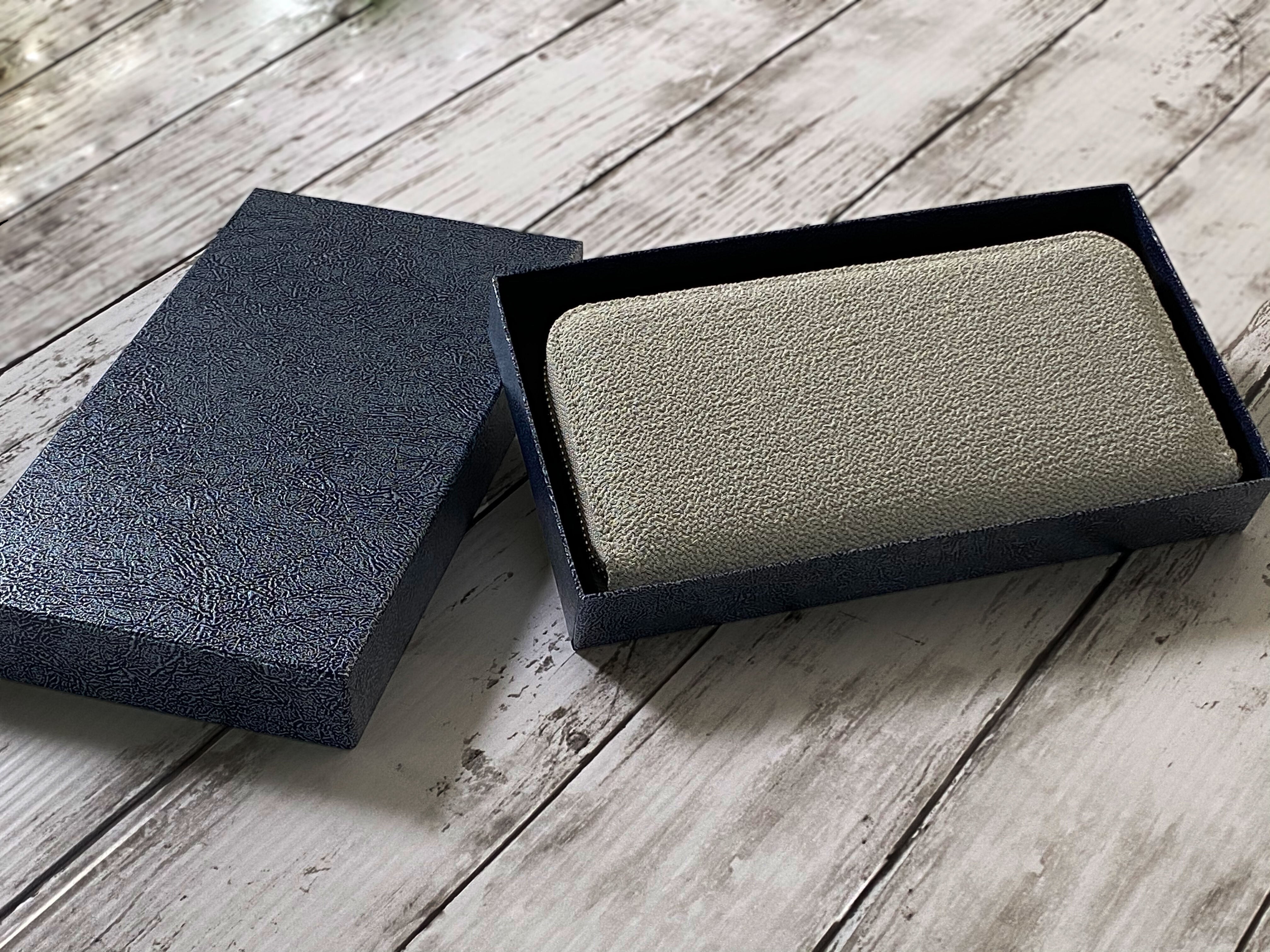 プロジェクトの財布サイズに合わせて作られた専用ボックスに入れてお届けします。