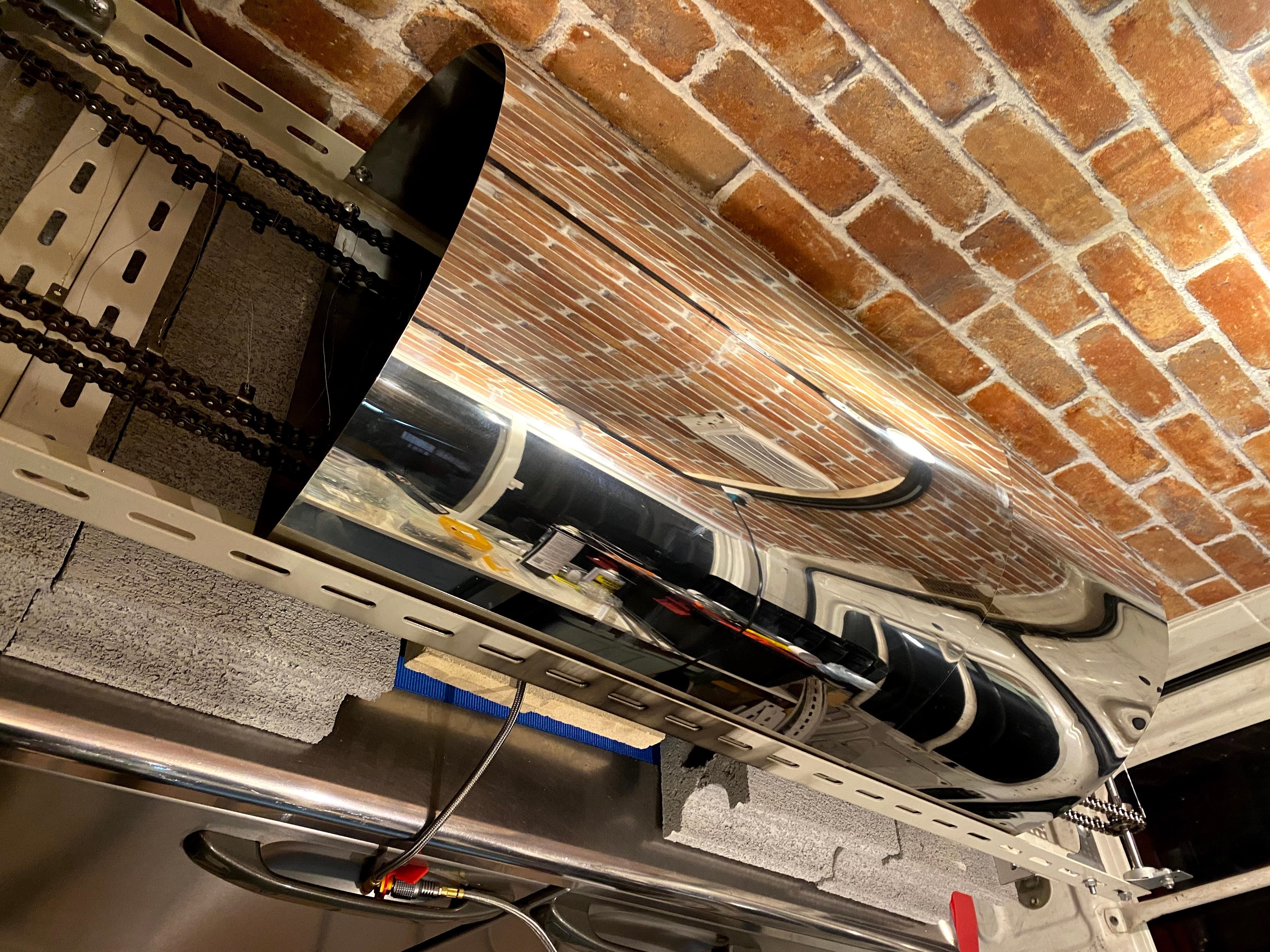 見た目はステンレスの半円柱ですが現代科学の粋を集めて作られたiotハイブリットベルトコンベア式ピザ窯「EBTG」です。コア部分に出力を集中させる構造で中程度の出力でも15分も経たず500度を超えます。本場ナポリのピザの条件である500度を達成することができました。