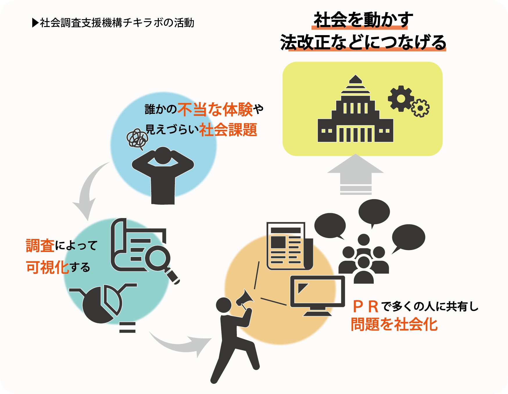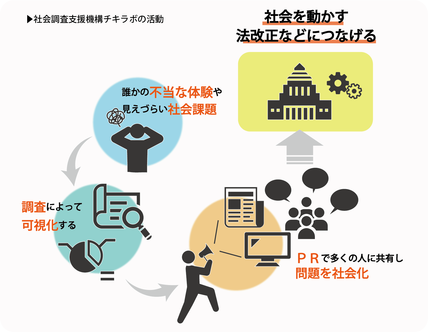 ハラスメント、人権侵害、差別など、世の中にある様々な社会課題を調査によって可視化。「当事者はどれくらいいるのか。」「どんな実態があるのか。」「効果的な施策は何か。」etc...を明らかにします。さらに、それを広報・PRによって多くの人に知ってもらい、問題意識を共有。そして、法改正など具体的に社会を動かすアクションにつなげていきます。