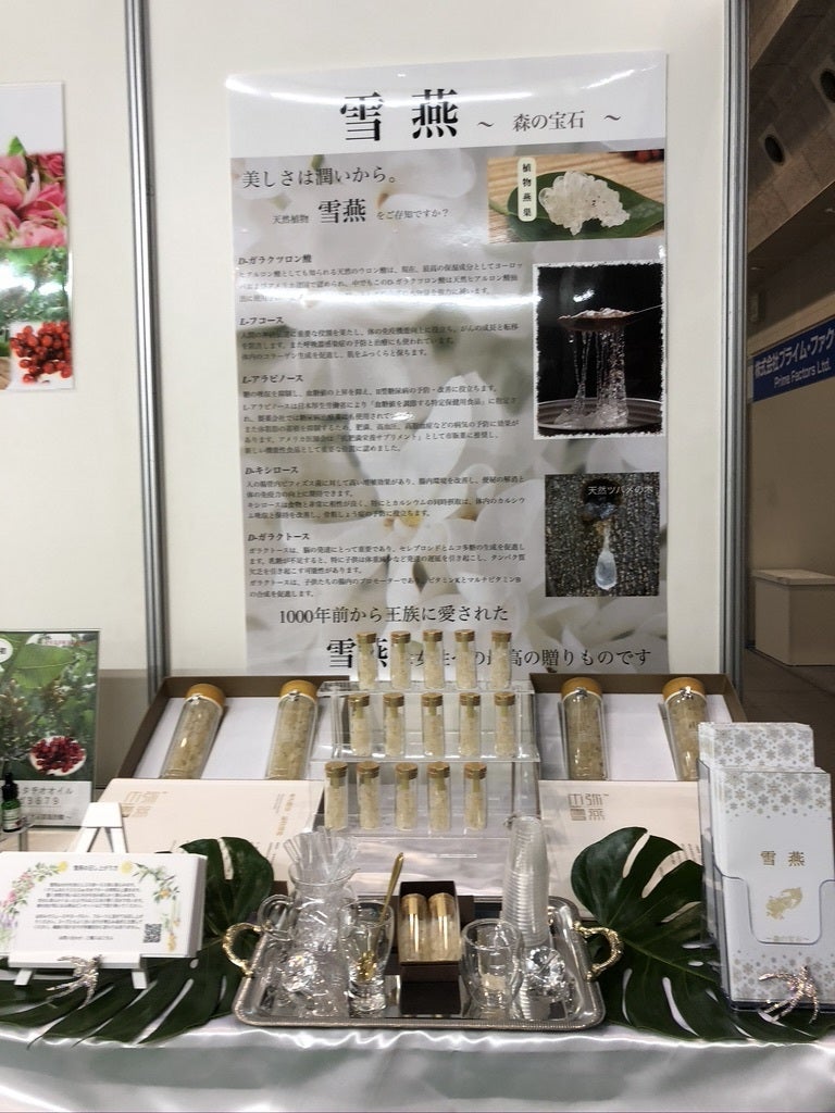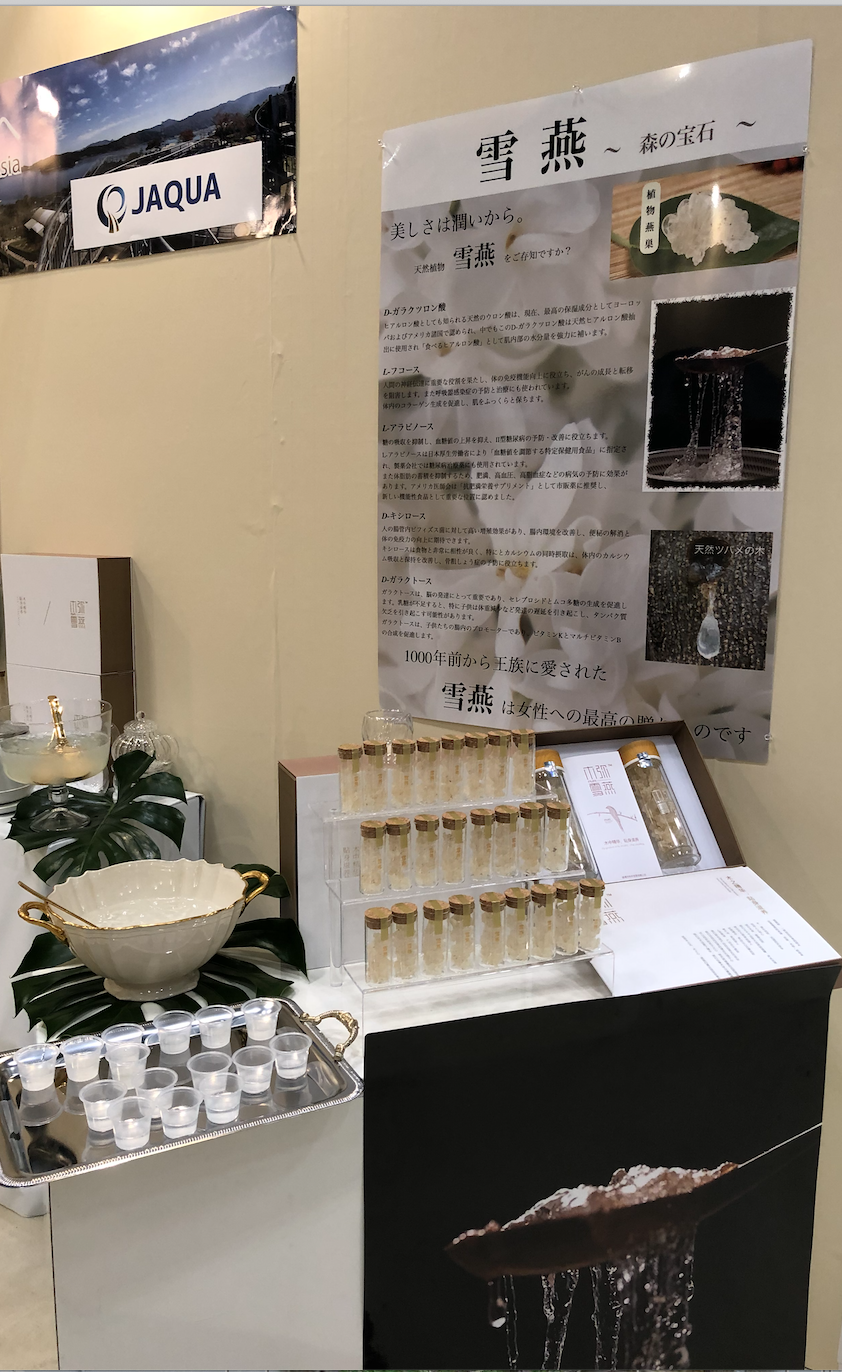 私たちはこの雪燕をなんとか日本の皆さんに知ってもらいたいと、まず東京開催の総合美容展示会に出展しました。すると来場者から驚くほどの反響があり、見たことがないキラキラしたジュレに常に試食ブースは黒山の人だかり。男性女性問わず多くの皆さんが目を丸くして質問の嵐でした。多くの雪燕の製品化を望む声をもらい、そこから私たちの雪燕との格闘が始まりました。どうしたら手軽に雪燕を多くの方の手に取っていただけるかの構想と製造工場の行脚を重ねてきました。難しい素材のため工場からは何度も断られ続け「どこの工場も出来ないと思うよ」と言われたときはくじけそうになりました。そんな時に決まって届くのが応援の声。その声に何度も勇気をもらい模索を続ける日々の中、救世主とのご縁があり、ついに日本初の天然雪燕の化粧品とデザートの開発に成功しました。私たちの情熱に寄り添ってくれた製造会社、工場の誠意には心から感謝しています。