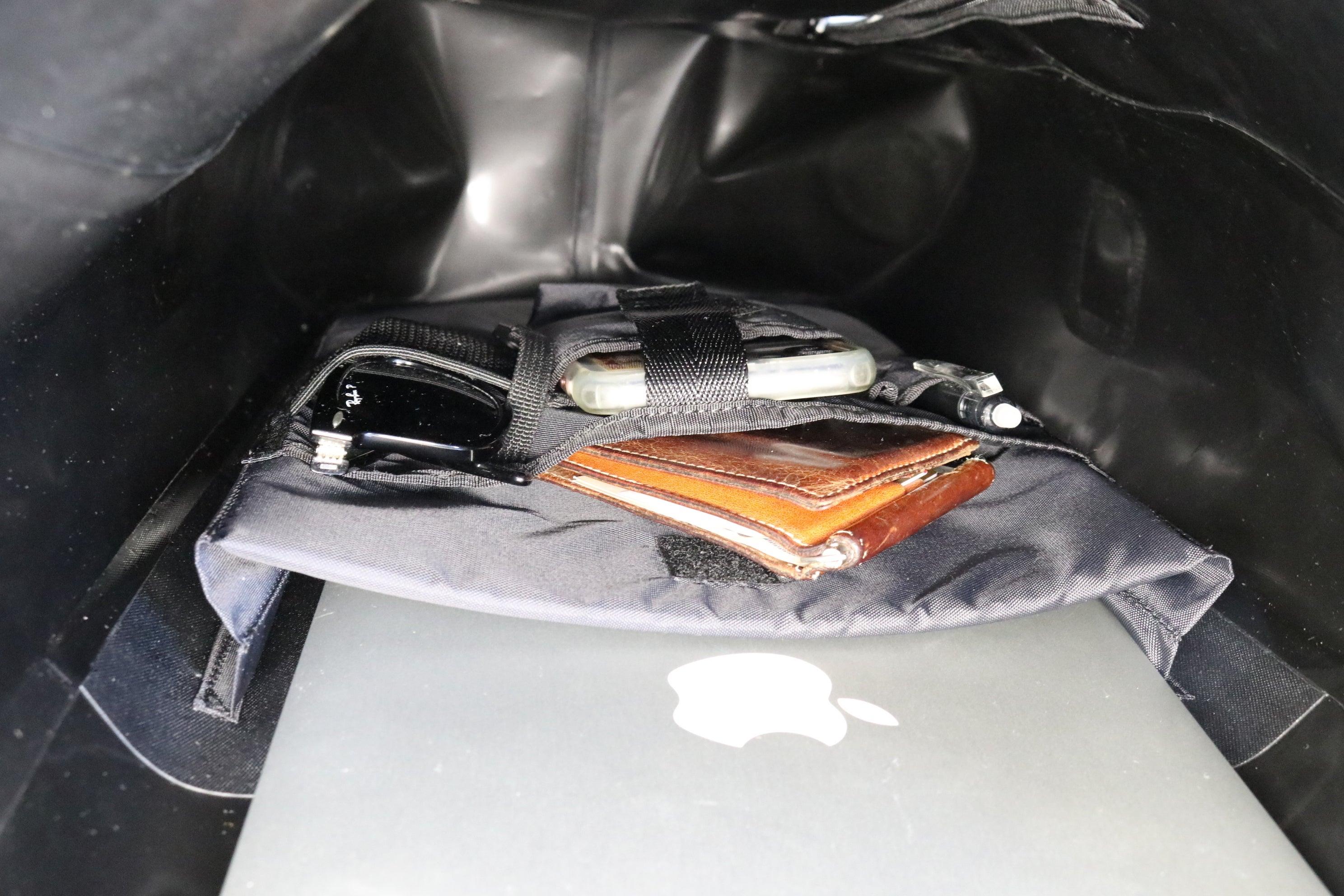 iphone、サングラス、財布、ペン、ノートパソコンの収納例