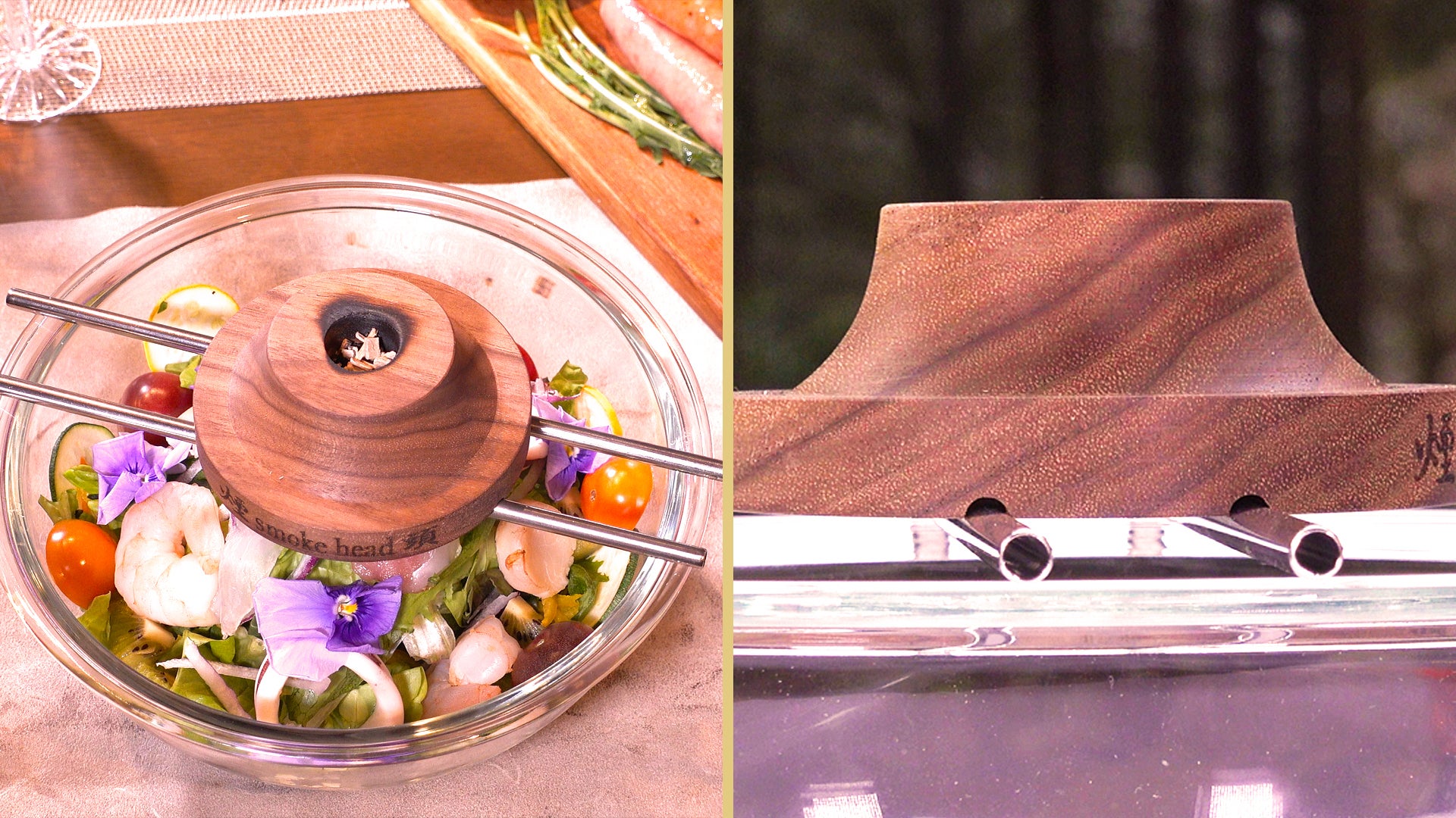 頂上にスモークチップをのせ、5秒間バーナーで燻すと下から煙が降りてきます。