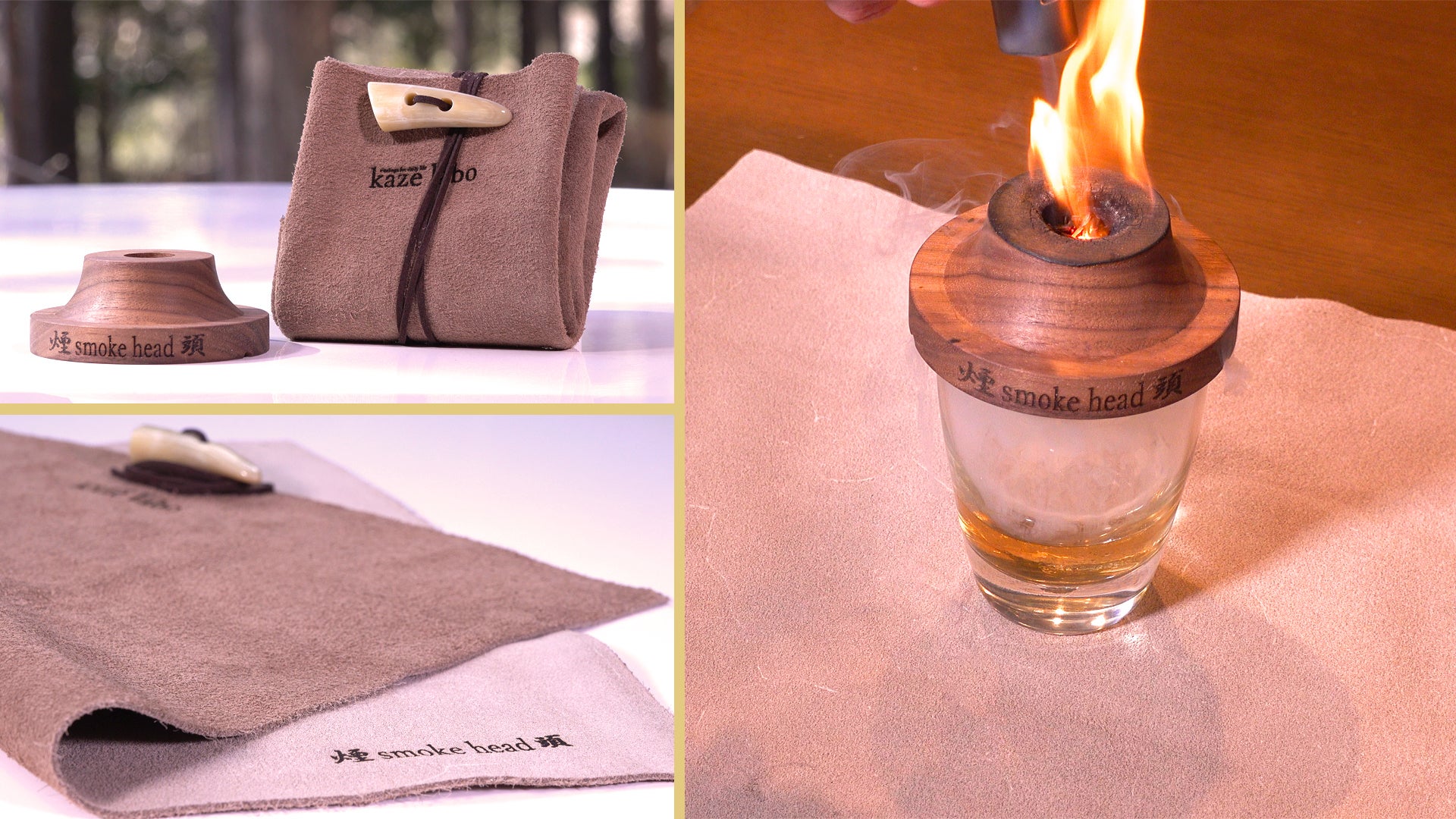 ① レザーの包みを広げてグラスや器を置き、煙頭 -smoke head- をセットします。