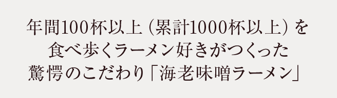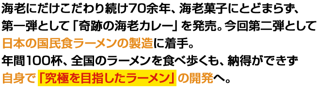 私は職業柄、食べるものには大変興味と拘りが強いのですが、特に日本国民の定番食の一つであるラーメンが好きでよく食べ歩きもするほどです。そこで自分の仕事経験と趣味を活かして「“海老のプロ”が、“海老好きに送る”、“海老好きのためのラーメン”」を開発すれば外食せずともご家庭で“究極の海老ラーメン”を堪能して頂けると決意を致しました。