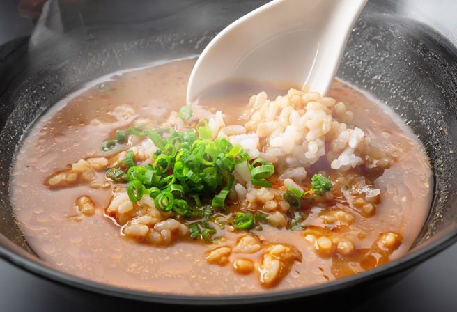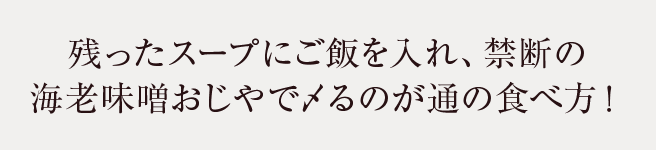 すべて飲み干したくなるスープですが、たまには少し残して温かいご飯とネギを入れて「えび味噌おじや」もたまりません。罪悪感と中毒性がせめぎ合うおいしさです。