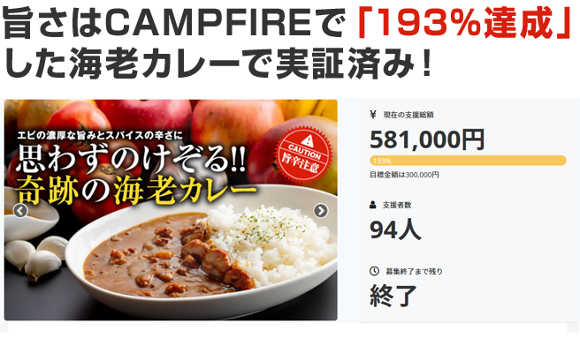 2020 年「奇跡の海老カレー」がキャンプファイヤーにて目標の193%を達成