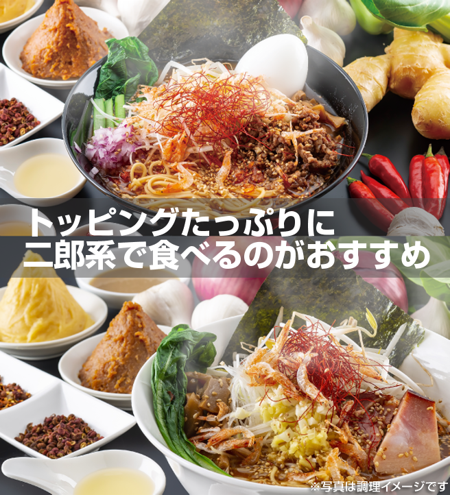 ゴロゴロ厚切りチャーシューまたは肉味噌、おろし生姜、おろしにんにく、もやし、唐辛子、青菜(写真は小松菜)、海苔、仕上げに干しエビと白ごまで海老の風味を更に増強。ビジュアルもおいしさのひとつ。あとは何も考えずかき込むだけ!