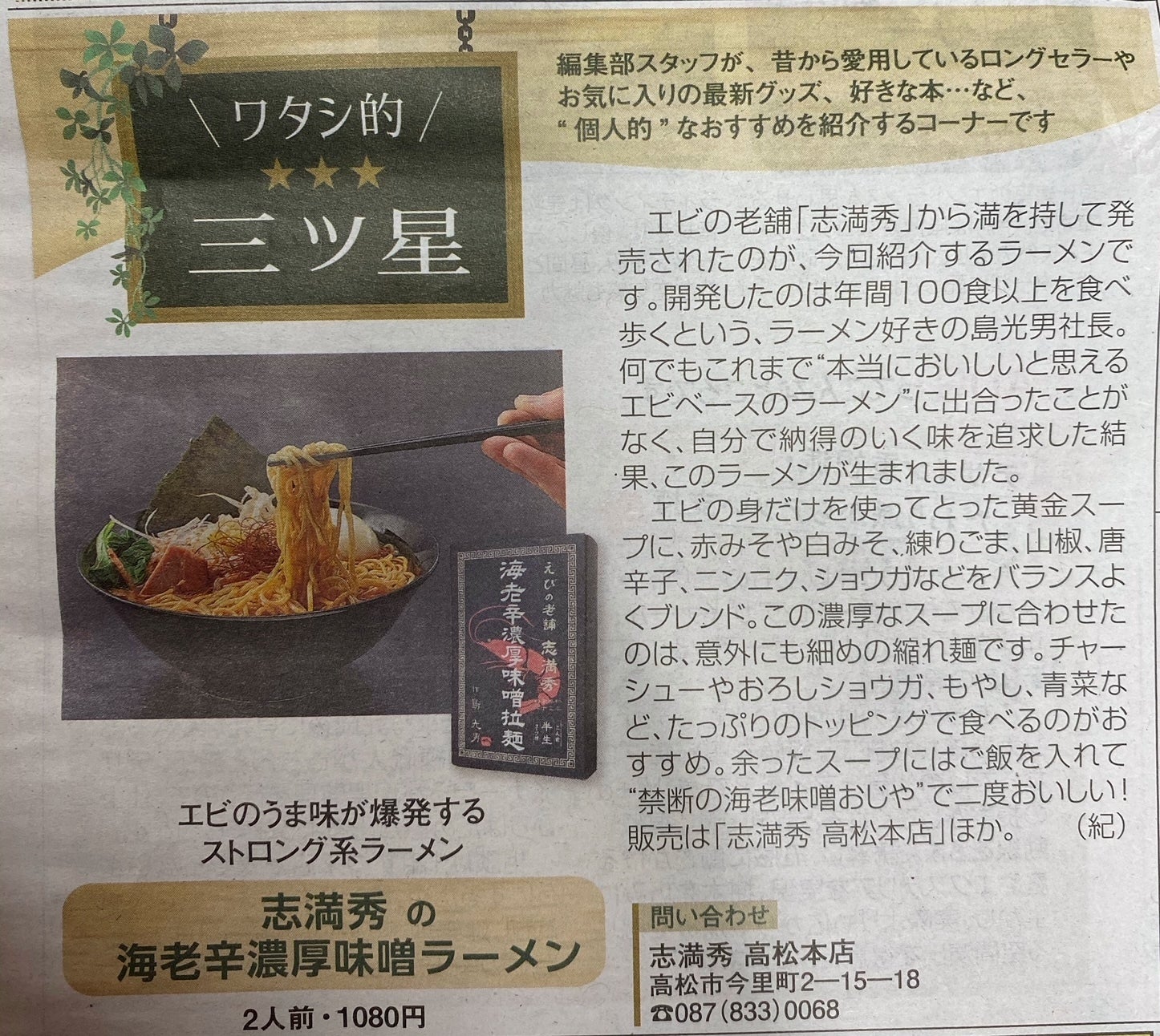 みなさま、あたたかい応援、ご支援ありがとうございます!「最後の一滴まで飲み干したい!禁断の海老辛濃厚味噌ラーメン」が地元紙に、編集スタッフのお気に入りで紹介されました。海老の旨味が爆発するストロング系ラーメン嬉しいお言葉、ありがとうございます!海老の旨さとシビ辛を実現した禁断の「海老辛濃厚味噌ラーメン」の応援をよろしくお願いいたします。