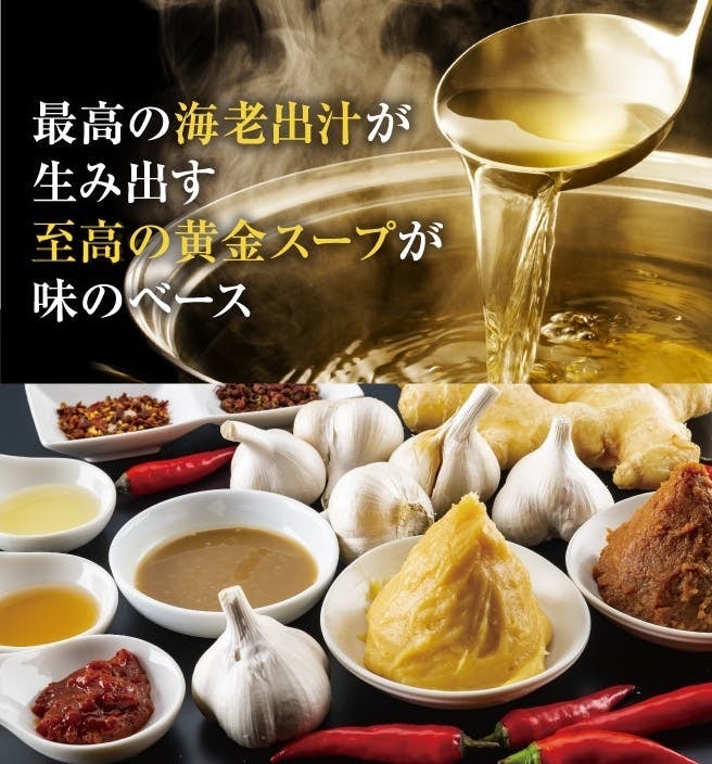 最後の一滴まで飲み干したくなるスープの秘密は、数多の「海老の身」だけを使った透き通る黄金スープと厳選素材です。