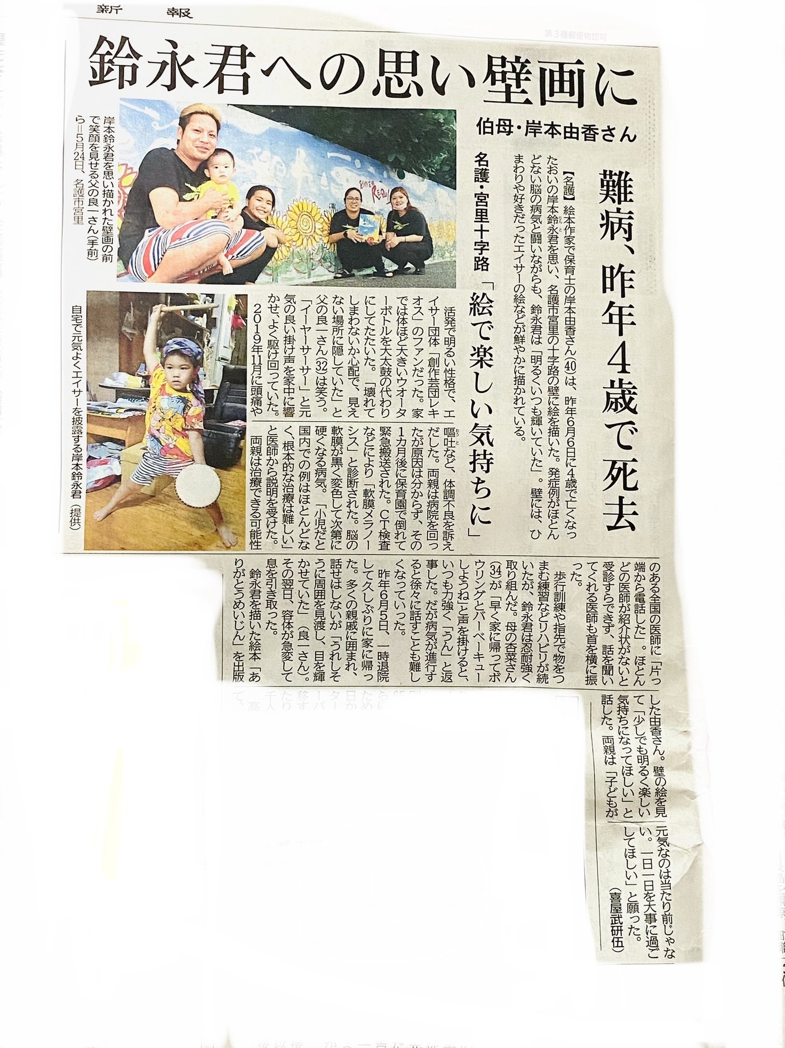 2021/06/19 14:24地元の新聞、琉球新報さんに絵本の事壁面の事家族の事りんとの事が掲載されました。壁面を描いてる中、記者の方に声をかけられ取材を受けました。どういう思いで壁面を描いたのから始まり、、、思いを伝えた所、弟夫婦の話もという事でこういう形になりました。6月19日付けの琉球新報で見ることができます。りんとや家族の思いが少しでもお伝えできれば幸いです。弟夫婦の「子どもが元気なのは当たり前じゃない。1日1日を大事にすごしてほしい」という言葉を受け止め生きていきます。ありがとうございました。 もっと見る