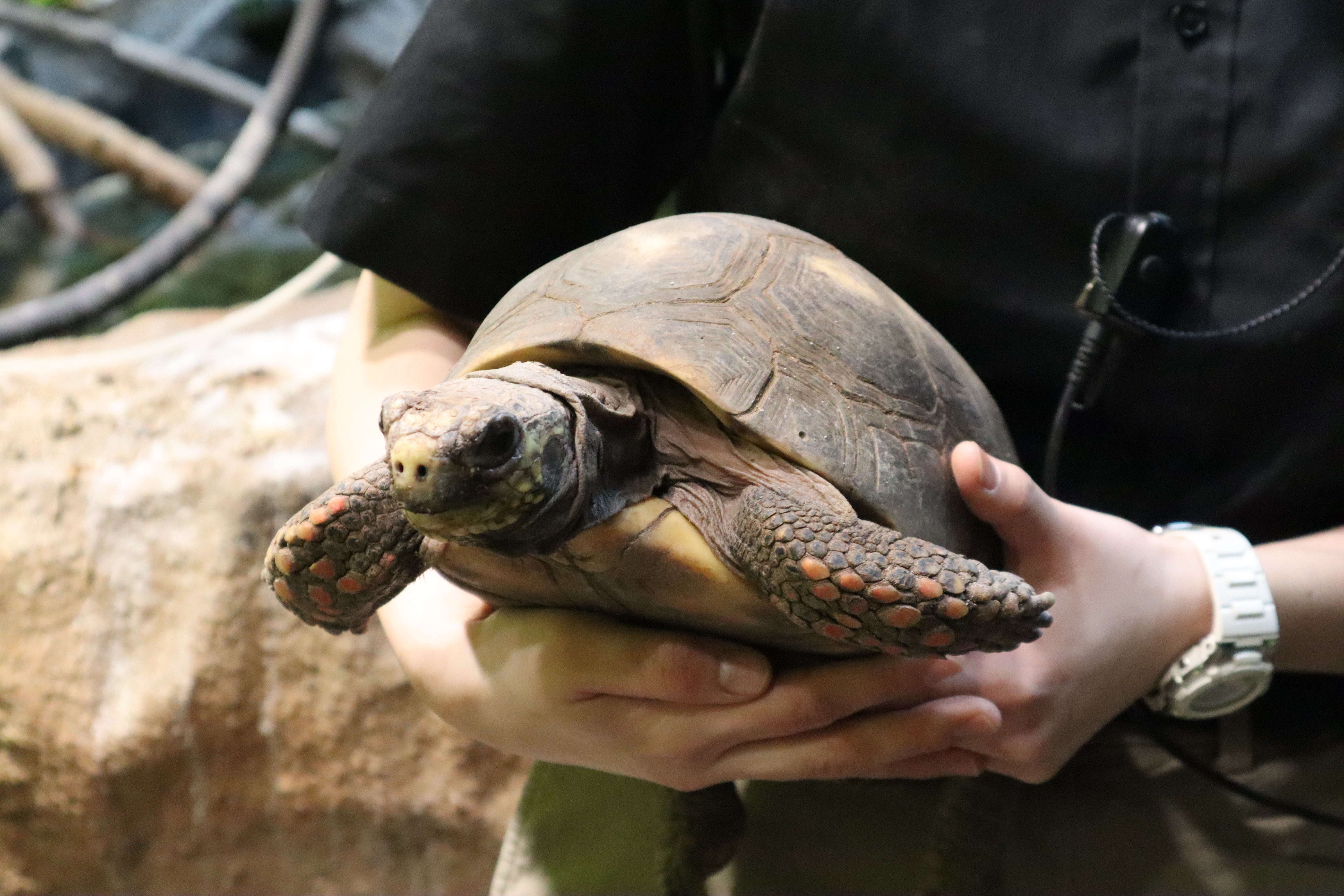 朝ツアーでは、アカアシガメのふれあいと記念撮影ができます。「アカアシガメ」の名前の由来となった足の赤さや、愛らしいつぶらな瞳を間近でご覧ください。