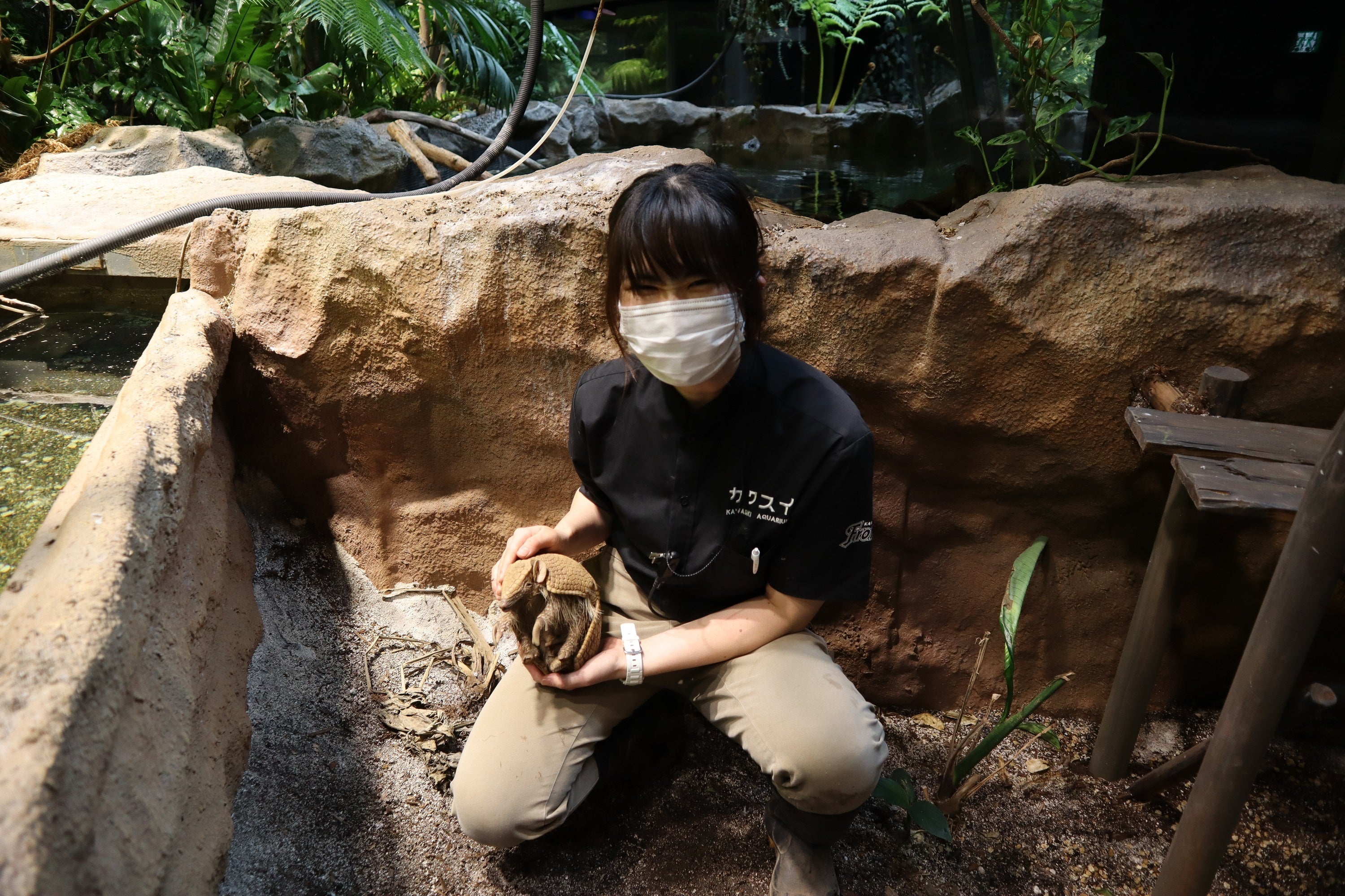 記念撮影だけでなく、アルマジロの特徴や普段の過ごし方など、クルーならではの視点で解説いたします。