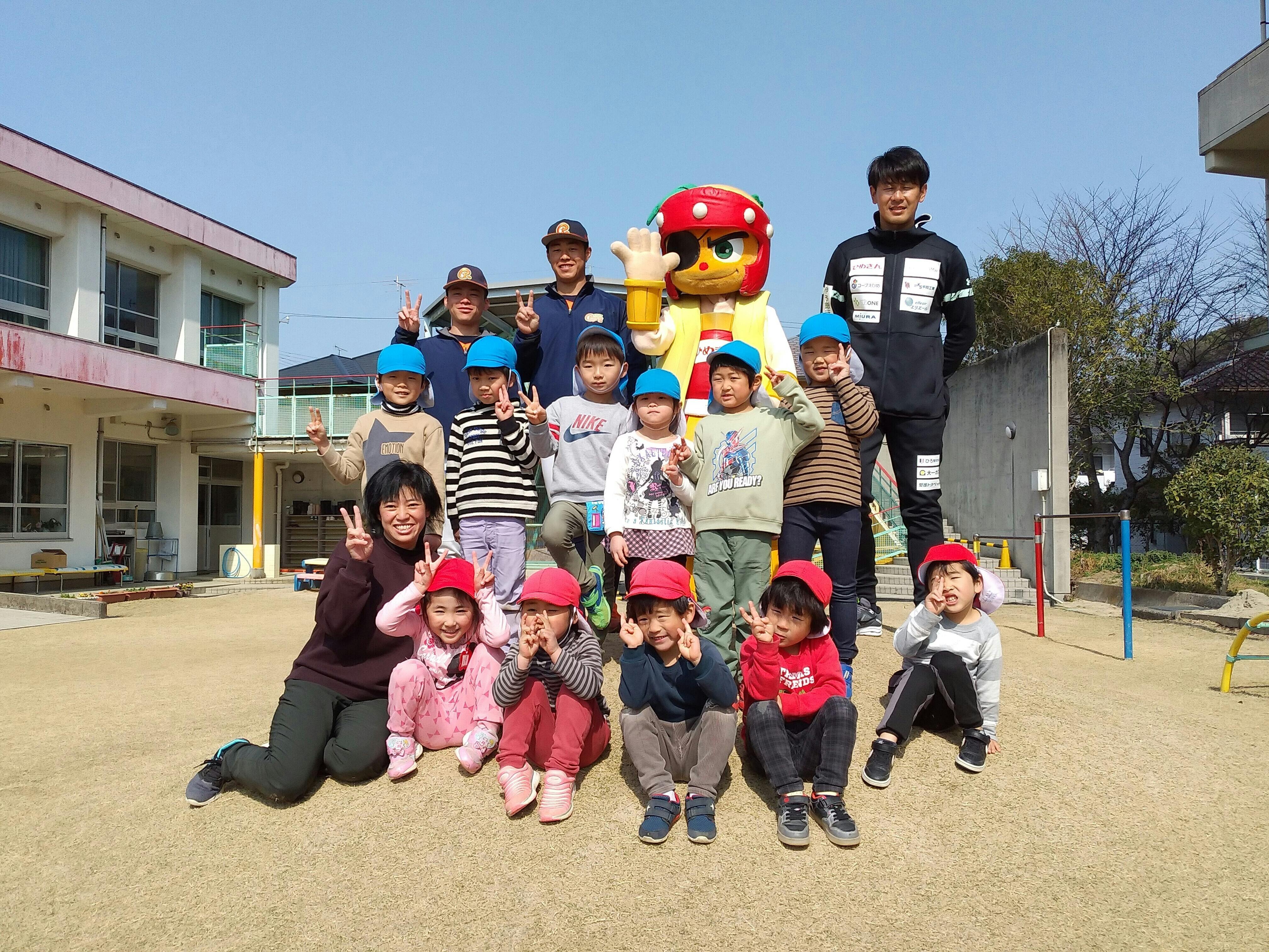 2月24日(水)には、松山市の坂本幼稚園を訪問しました。園児11名の小さな幼稚園ですが、みんな大喜びで選手や球団マスコットキャラクターのマッピーを迎えてくれました。
