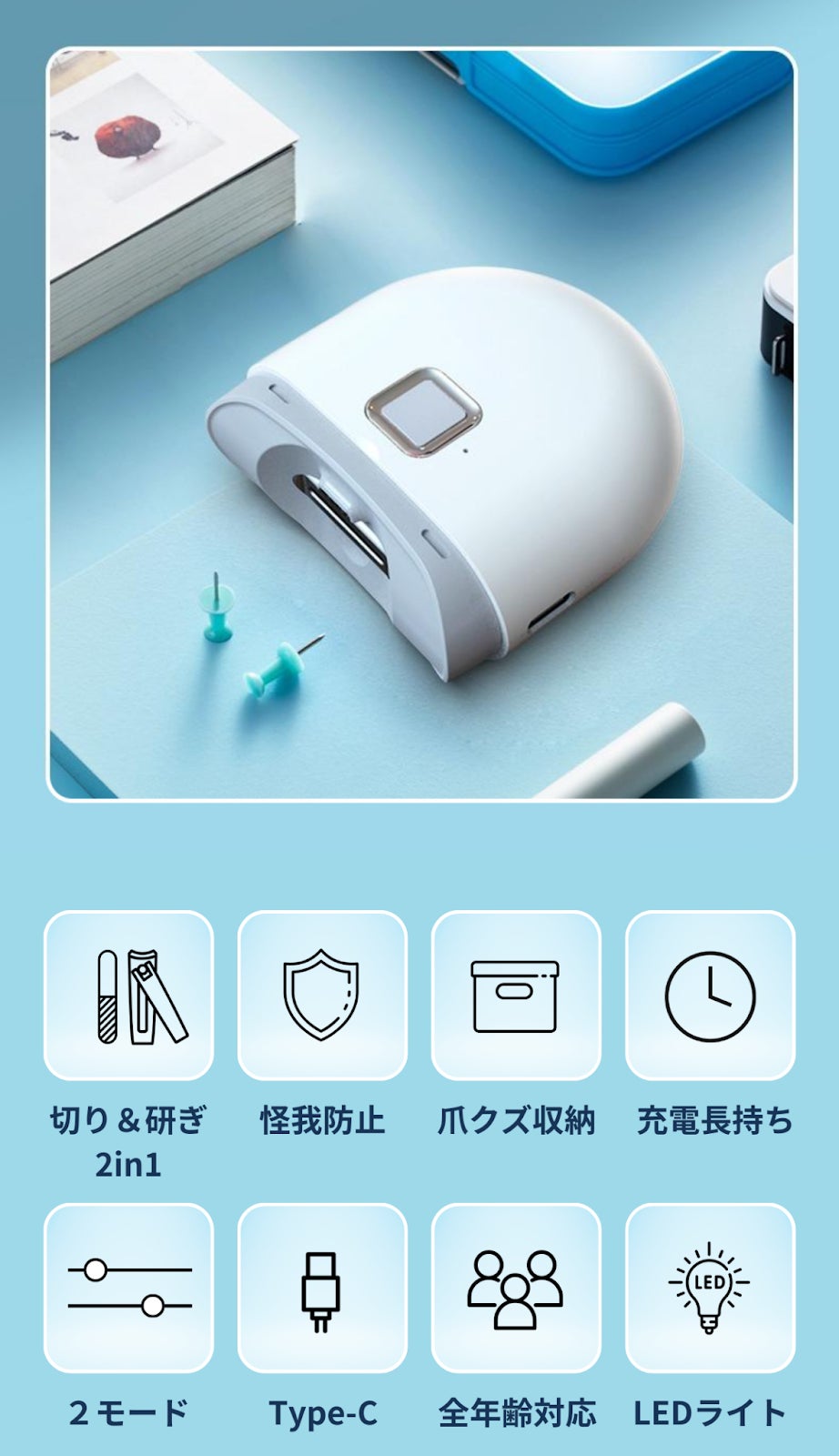 ワンタッチで爪削り、刃物不要で負担なし!削りカスケース内蔵で飛び散らず、簡単に捨てられる。お掃除ブラシ付きで清潔、300mAhバッテリーで長持ち。LEDライト付きで暗所でも安心!