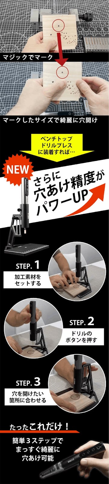 木材から金属まで自由自在に加工ができて、穴あけ精度も高いコードレスミニルーター「BOLTZ」です!
