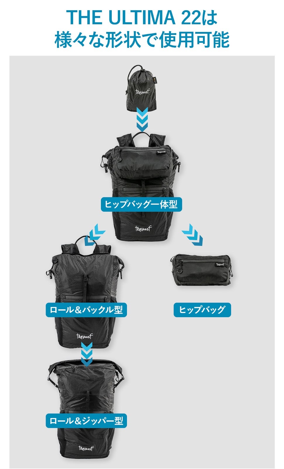 285gで22L収納!350ml缶サイズまで小さくなる究極の多機能バックパック