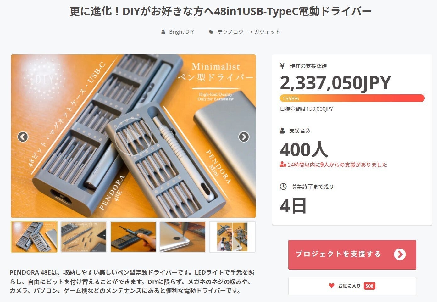 この度は「更に進化しました!DIYがお好きな方へ48in1USBType-C電動ドライバー」にご支援頂き誠にありがとうございます!皆様のご支援のおかげで、目標金額1700%を突破することができました。締切まで後3時間です!!!BrightDIYチームは当プロジェクトをより多くの方へ知って頂きたいと考えております。よかったら、FacebookやTwitter等のSNSでのシェア・拡散をお願い致します。https://camp-fire.jp/projects/view/389136『本プロジェクトをご支援いただいた上で』SNSシェアボタンよりプロジェクトをシェアしてくださった方全員に「3in1 EDC ミニカードナイフ 」をプレゼントさせていただきます!【応募方法】① 本ページ内のFacebookまたはTwitterシェアボタンよりシェア!② BRIGHT DIYのLINE公式登録:ここをクリック!③ シェアしていただいた投稿URLをLINEでお知らせください。応募期間:CAMPFIRE公開期間中※リターン配送に同梱されます。PENDORA SERIESに興味ある方は是非BrightDIYホームページをご覧ください。https://www.brightdiy.jp/どうぞよろしくお願い致します。BrightDIYチーム