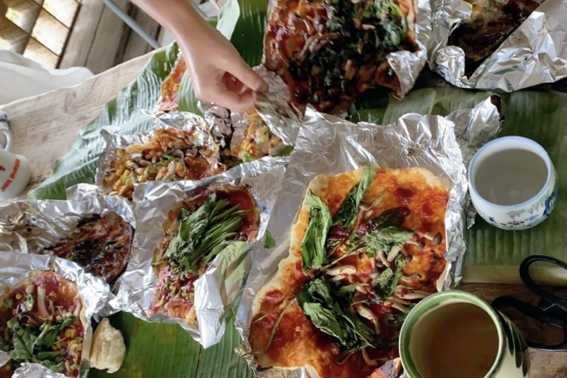 (仲間と野草や育った野菜をトッピングした手作りピザパーティー)