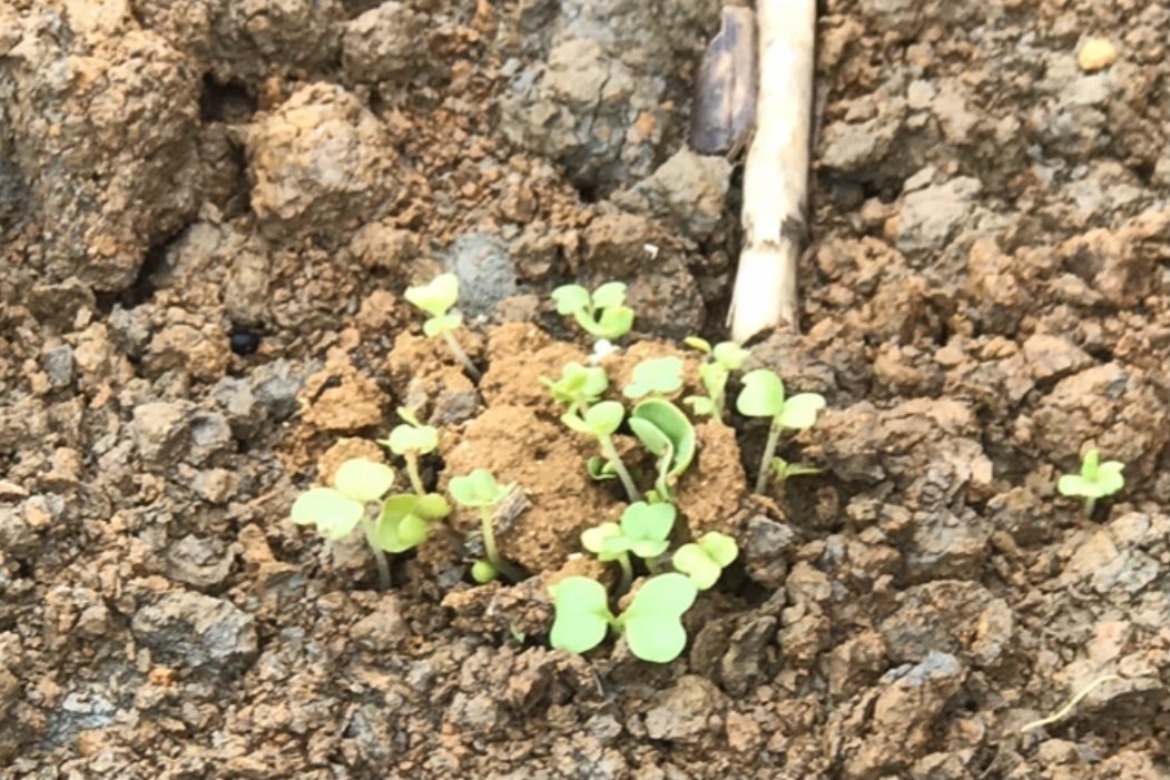 (名護市真喜屋の畑)2019年には、糸満に10坪の畑を借り、粘土団子をまくだけ、という方法で、実際にレタスや小松菜、チンゲンサイ、ほうれん草、水菜などの野菜が一緒に育つさまを観察することができ、その感激から
