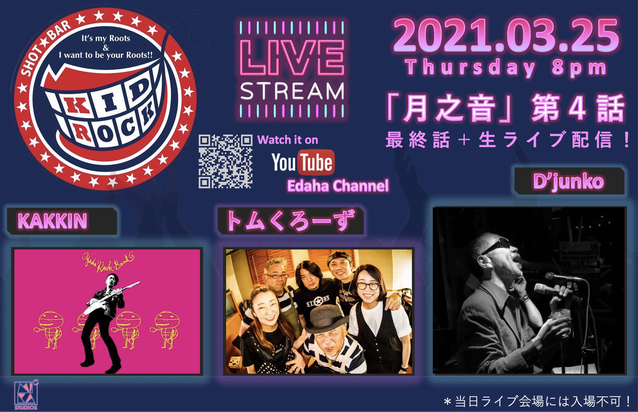 WEBドラマ「月之音」の最終話となる第4話:ライブ配信の日時が決定しました!・日時:3月25日(木曜日)夜8時〜・配信チャンネルは当ドラマを配信している、Edaha チャンネルにて配信いたします!https://www.youtube.com/channel/UClor0kRcfxnd-Al_c9kIWWg当日のライブ配信に出演して頂くのは、福岡の音楽シーンを牽引され、とびっきりファンキーで素敵過ぎる"D`junko" "KAKKIN" "トムくろーず"です!遂に今ドラマもフィナーレを迎えようとしています!最後まで走り抜けますので、ライブ配信を一緒に楽しみましょう♪
