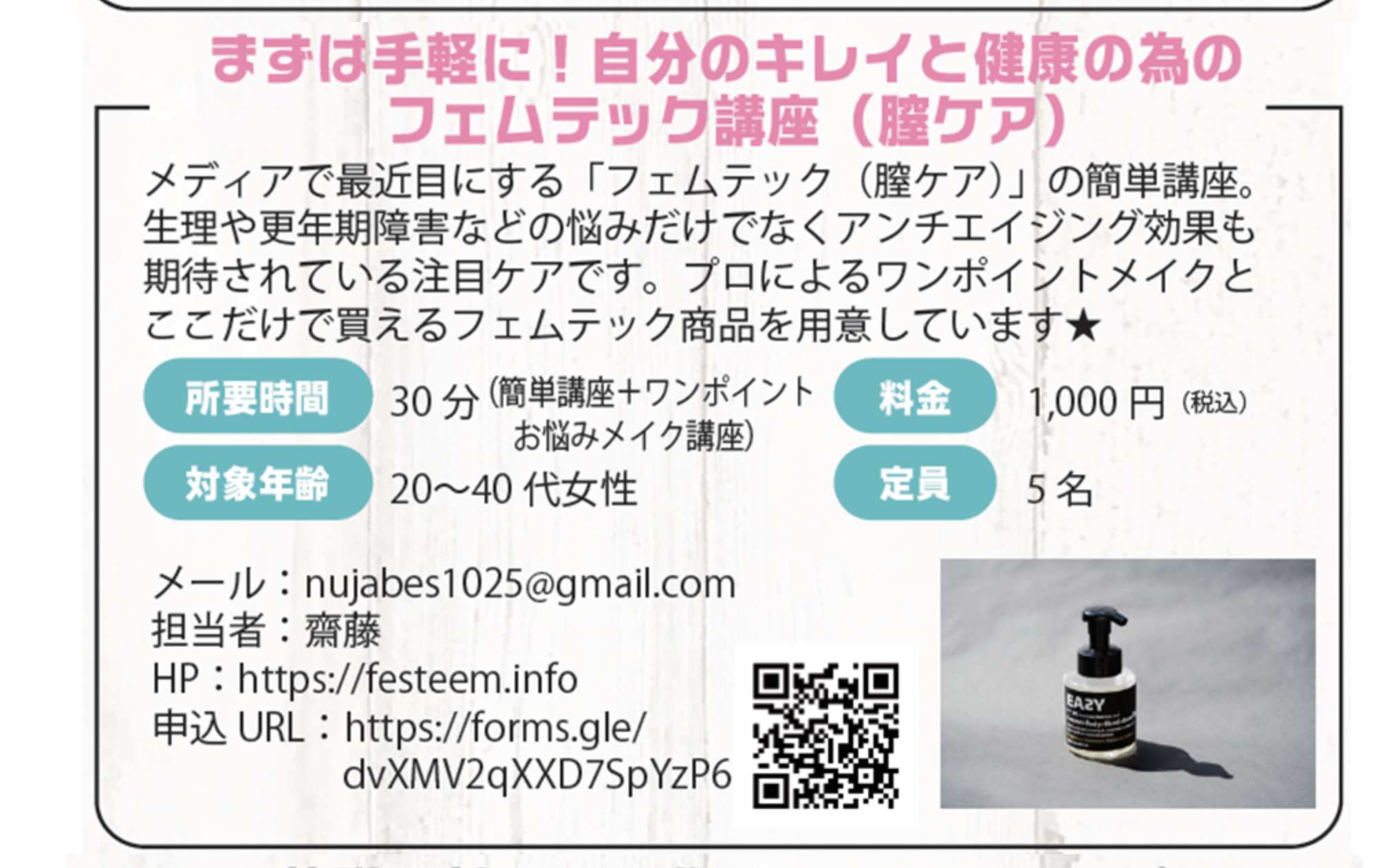 フェムテックやフェミニンケアを世の中にもっと広めたい!!と思い、8月にフェムテックのミニセミナーとポイントメイク講座(トータル30分程度)を開くことになりました!!限定10名なので、気になる方はお早めに連絡ください。(nujabes1025@gmail.com)<フェムテック+ワンポイントメイク講座>1.フェムテックミニセミナー(15分) ★フェムテックとは? ★今から始められるフェミニンケア2.ワンポイントお悩みメイク講座 ★お悩みのパーツのメイク講座(1人5分) ※マスクメイクをどうすればいいかわからない、眉がうまく描けないなど、 メイクでお悩みのワンパーツをその場でカウンセリングしながらメイクを解決します。これからフェミニンケアを始めたい方、メイク講座を手軽に受けたい方、ぜひぜひお待ちしています。<詳細>■女性起業家によるテスト出店企画『MUSAKOトライアルマーケット』 期間2021年8月18日(水)~22日(日) 11:00~17:00 (講座は8月22日の12:15〜/14:45〜の2回。@MUSAKO HOUSE1階) ※各回に限定5名様限定。 https://musashikoyama-sc.jp/page.php?id=56まずフェムテックという切り口で講座を始めますが、もっとこういうことが知りたいとか、講座で取り扱ってほしいことがありましたら、是非ともご意見お待ちしています。よろしくお願いします!!!