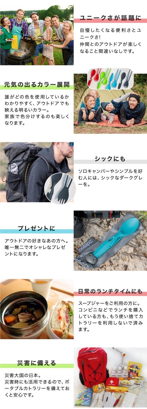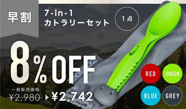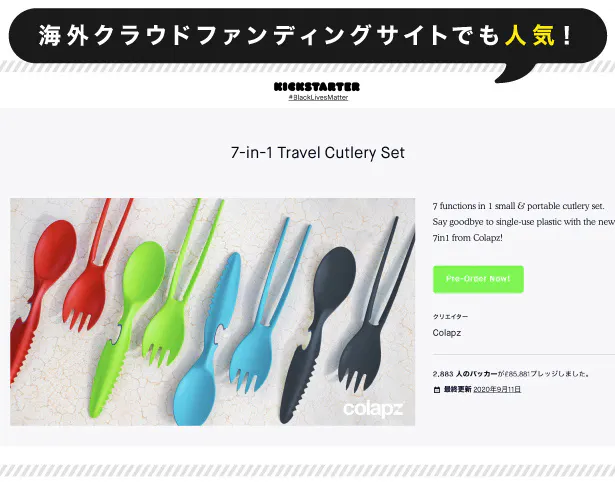 2021/03/16 07:30ご支援いただきました皆様へ昨夜プロジェクトが無事終了しました。目標金額の約10倍ものご支援をいただくことができました。皆様には心から感謝しております。商品の在庫は日本にございますので、早ければ今週中に発送させていただきます。改めて発送完了のご連絡をさせていただきますので、しばらくお待ちくださいませ。暖かくなってきてアウトドアに出かけたくなる季節になってきました。ピクニック、登山、キャンプ、釣りなど、様々なシーンでご活用いただけましたら幸いです。また、コンビニなどでの使い捨てカトラリーも無くなる方向に進んでいるようです。マイカトラリーをエコバッグ同様常に持ち歩くような時代がくるかもしれません。そんな時にも軽量・コンパクトな7in1カトラリーをお役立てくださいませ。災害時の備えにも安心です。何かご質問やご感想などございましたら、・Campfire商品ページ下部「意見や質問を送る」から・インスタグラム (アカウント名:colapz_cutlery_jp )からDM・info@u-blm.comへお気軽にご連絡くださいませ。インスタグラムでは今後のお得な情報や新商品情報などに関してお届けして参りますので、是非フォローをお願いいたします。それでは改めまして、皆様ご支援誠にありがとうございました。今後どもどうぞよろしくお願いいたします。 もっと見る終了まであと2日となりました。