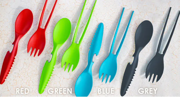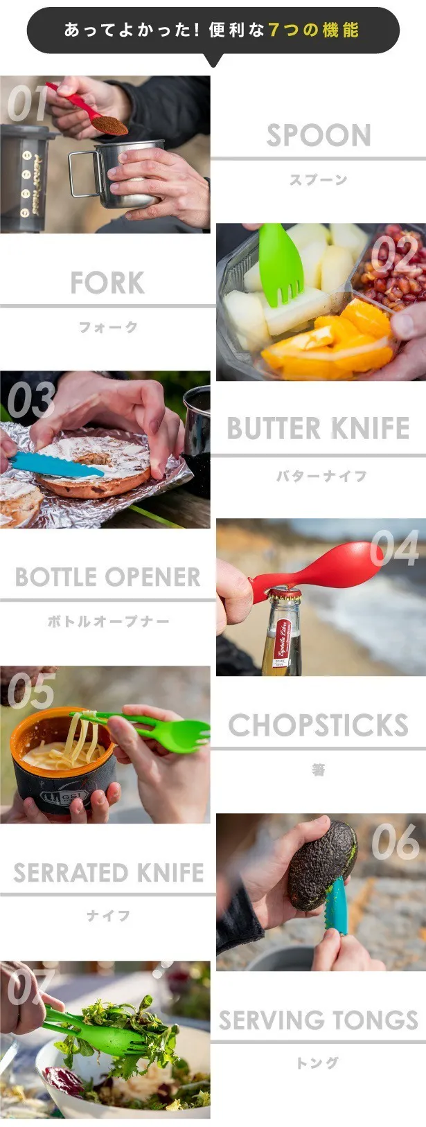 1セットで7機能を持つ 頑丈カトラリー です。
