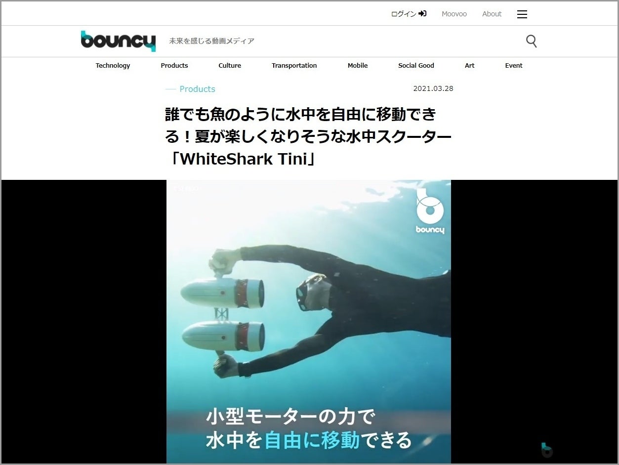 ”「未来をより良くしたい」と願っているファンと交流しながら、多くの視聴者に分かりやすく親しみやすい動画をプレゼントする。見終わった後にちょっと未来に前向きになれる。そんな動画メディア”(https://moov.ooo/about#bc-about-block)「bouncy」に、未来を感じるガジェットとして 水中スクーター WhiteShark Tini が掲載されました。