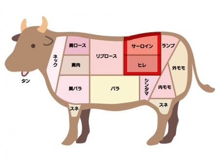 黒毛和牛でもステーキに向いた2種類の部位をご用意しました。まず1つ目はサーロイン。サーロインはロース肉の1種で背中の中央部分のお肉になります。適度にサシが入り、非常にジューシーでやわらかい部位です。上質な脂とお肉の旨味が両方味わえる贅沢な部位です。2つ目のヒレですが、ヒレは腰から背中にかけての肉で牛肉の中で最も柔らかく、脂身の少ない赤身肉です。お肉の旨味をダイレクトに味わえる貴重部位です。
