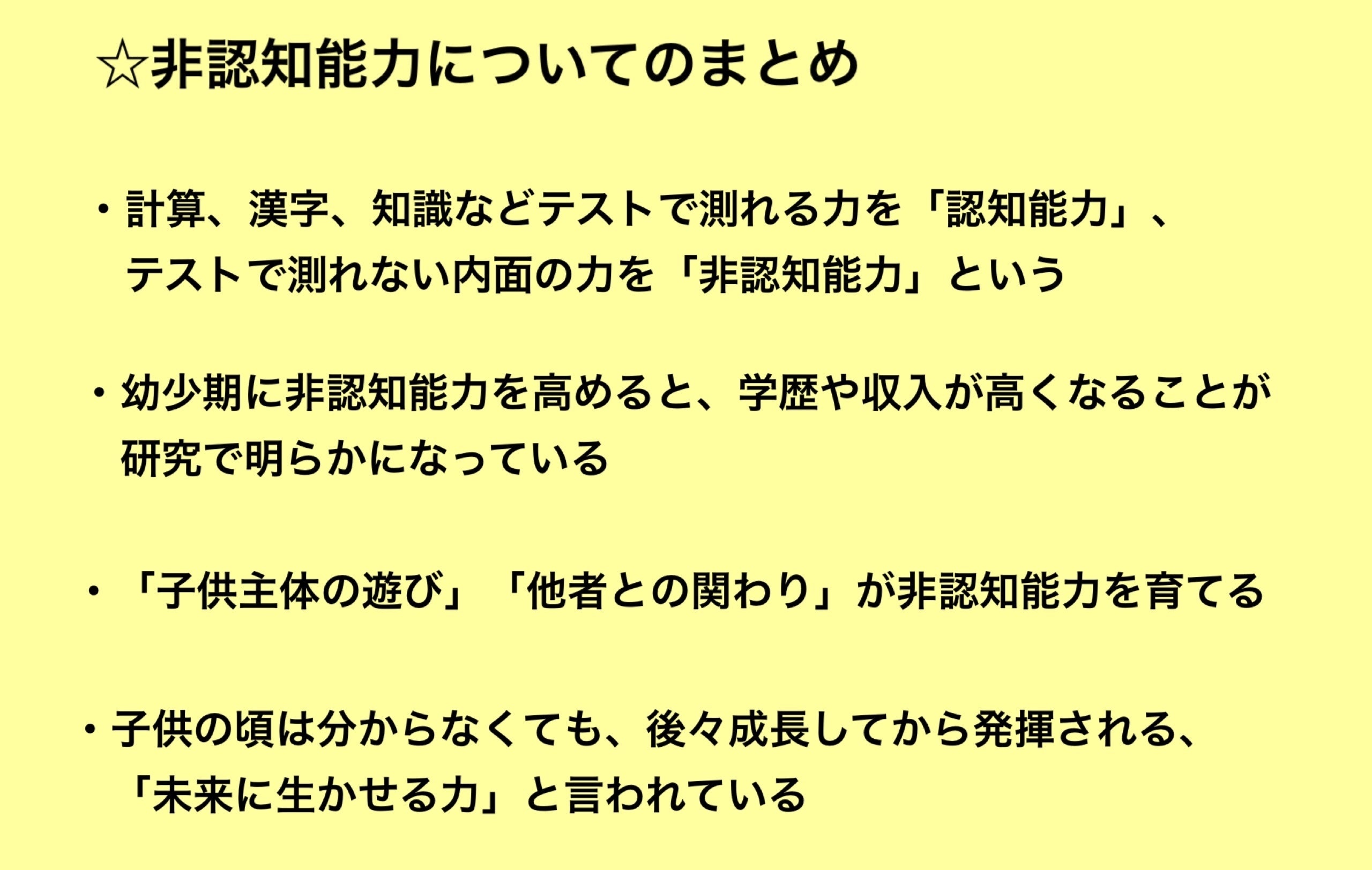これらの実体験を通して私が思うこと、それは、社会では、学力とは違う力、つまりコミュニケーション力、協調性、創造性、忍耐力、自制心といった力が求められているということです。子育てをしだしてから知りましたが、この力は「非認知能力」と言われ、教育現場でも、急速に変化する社会を生き抜く力として、注目が高まっている力だそうです。