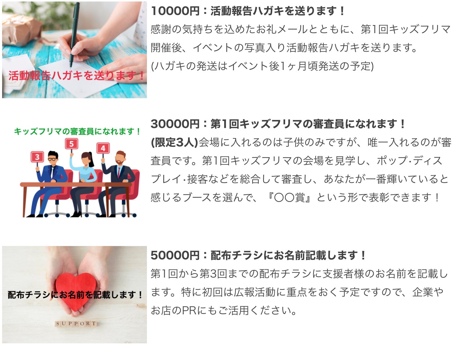 ※開催目標を10年間とし、できる限り継続運営していきたいと考えています。そのために、初回から第3回までで基盤を整え、第4回以降は出店料だけでも運営費がまかなえるよう、できるだけ継続運営の負担がなく開催できるようにしたいと思っています。初回は、基盤を整えるためのホームページや備品購入とともに、イベントに参加したい熊野エリアの子供達が開催を認知できるよう、チラシ配布などの広報活動にも重点をおきたいと考えています。