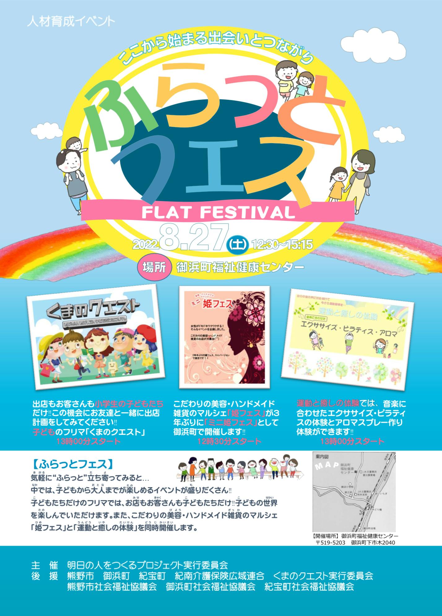 今回、熊野市、御浜町、紀宝町と3市町それぞれの社協のご協力のもと、「ふらっとフェス」という「福祉」との出会いを促進するイベントの一環として行うことになっています。