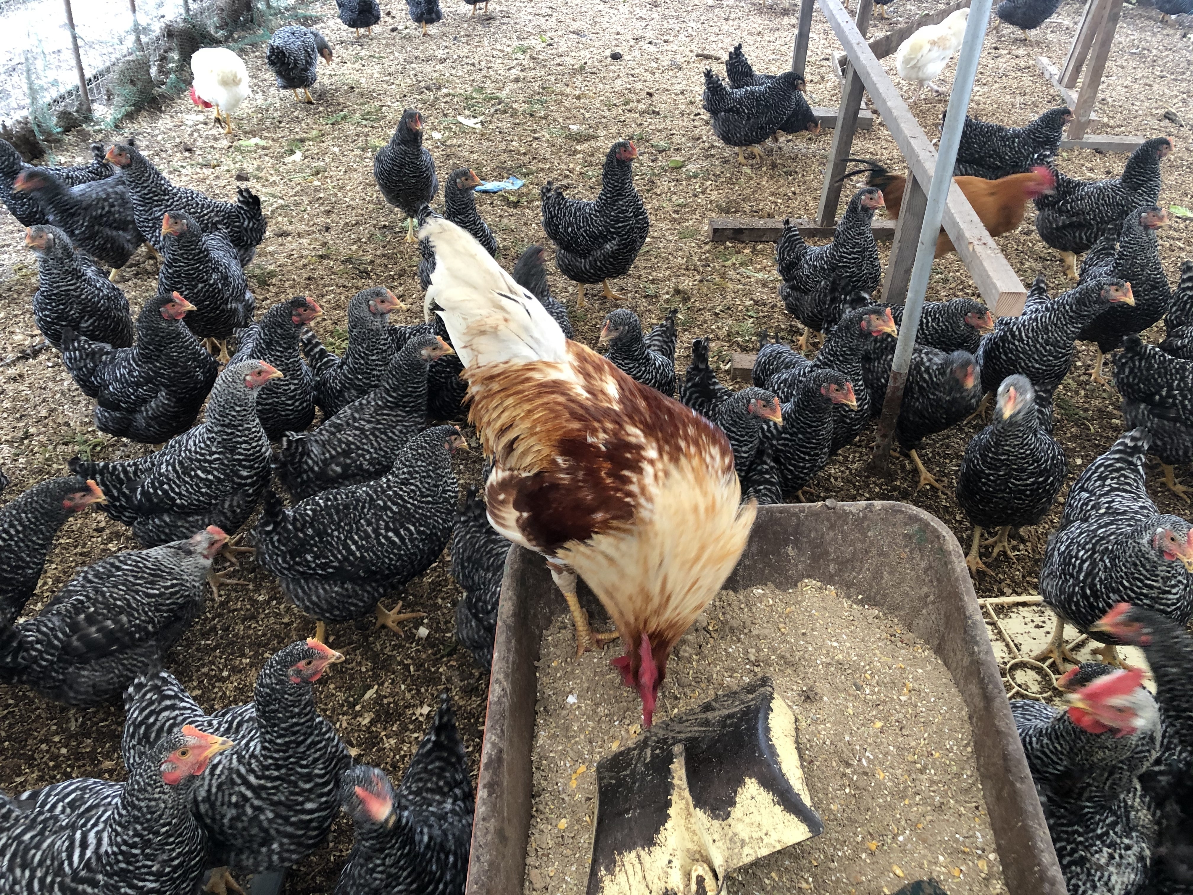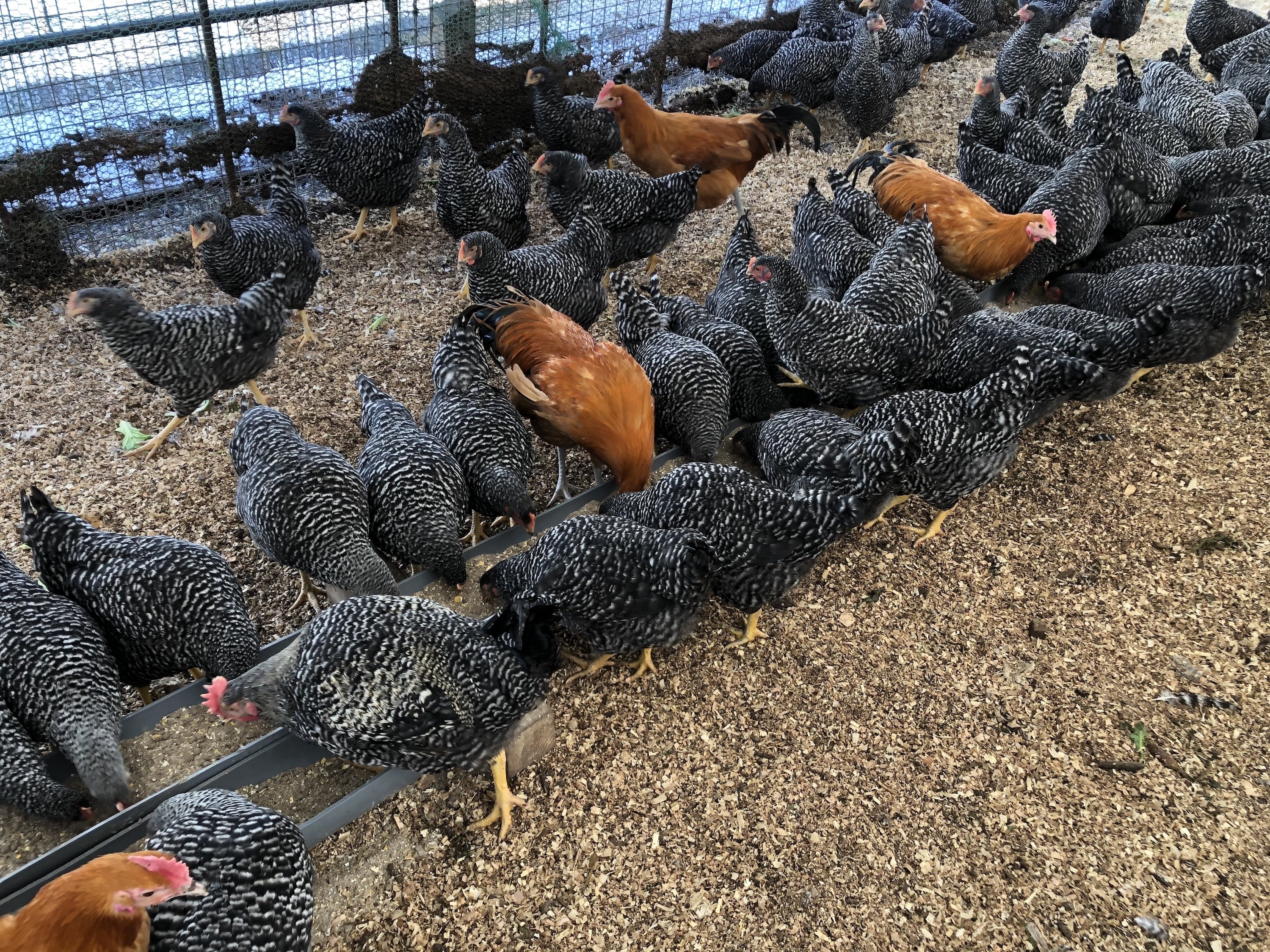 岡崎おうはん 124日目食事中です。オスは名古屋コーチンやアローカナなどいろいろな種類がいます。