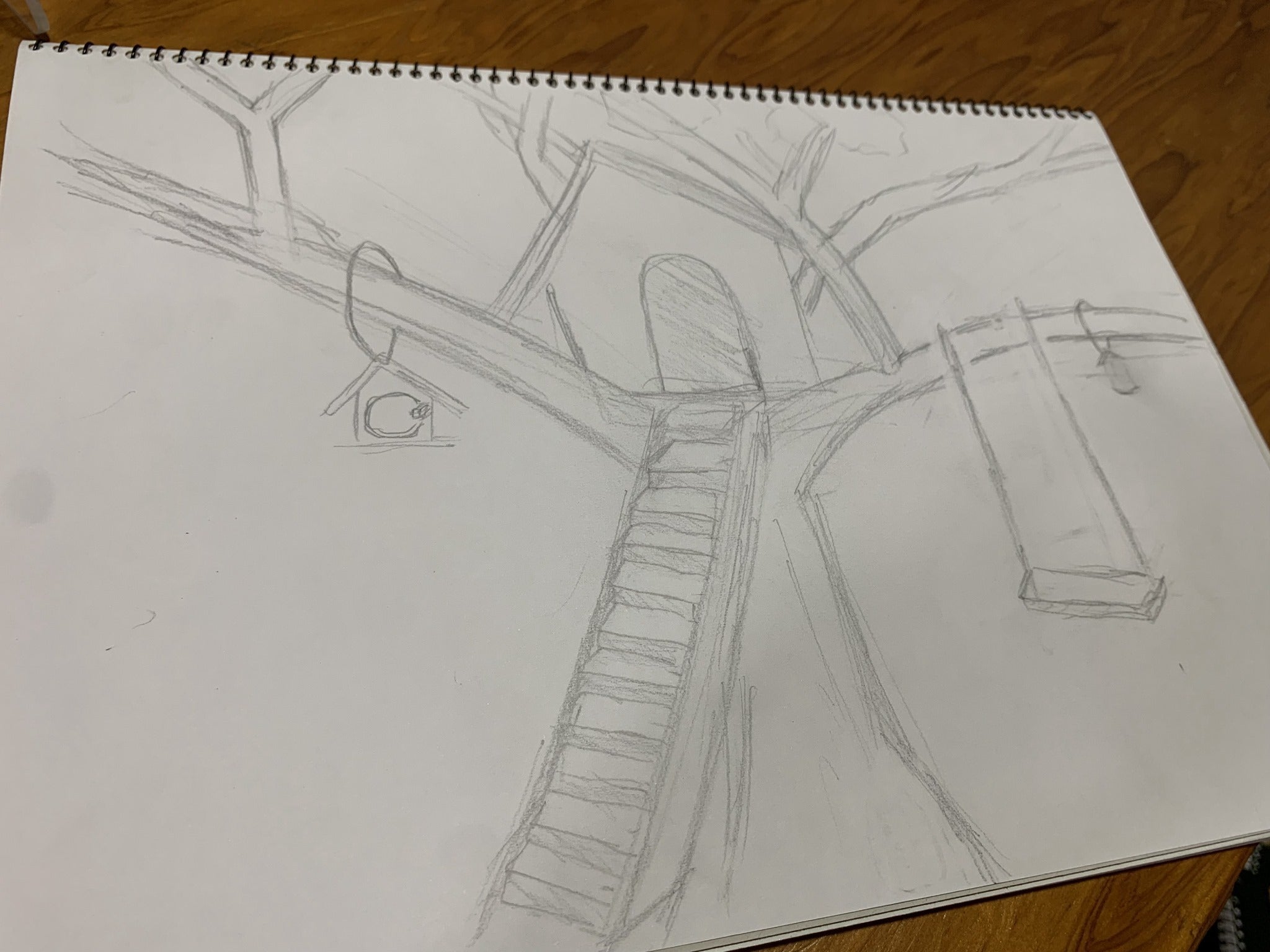 木に登ってツリーハウスができた時の目線を実際に感じて、どのようなデザインにするかを考え、スケッチブックでイメージ図を描きました。