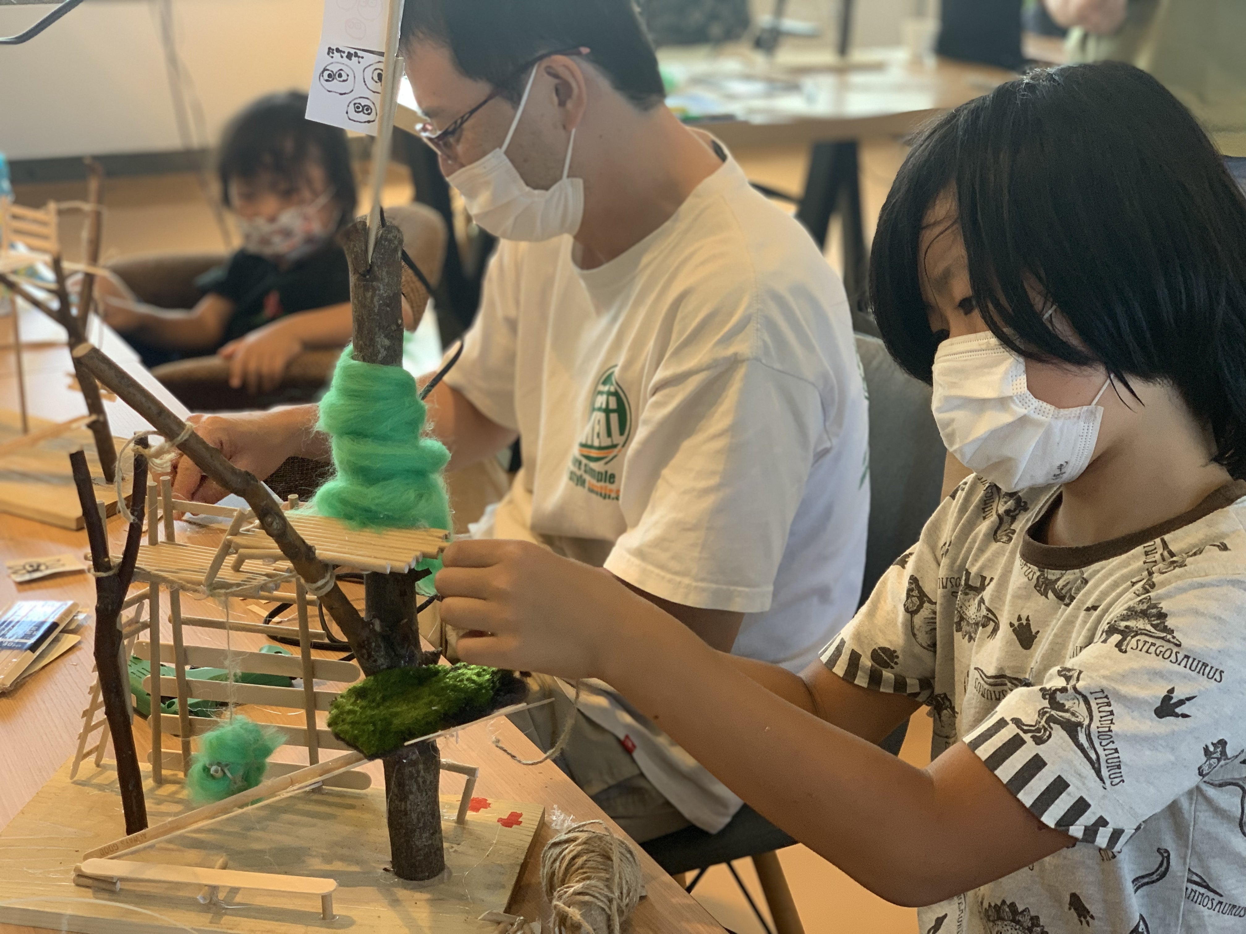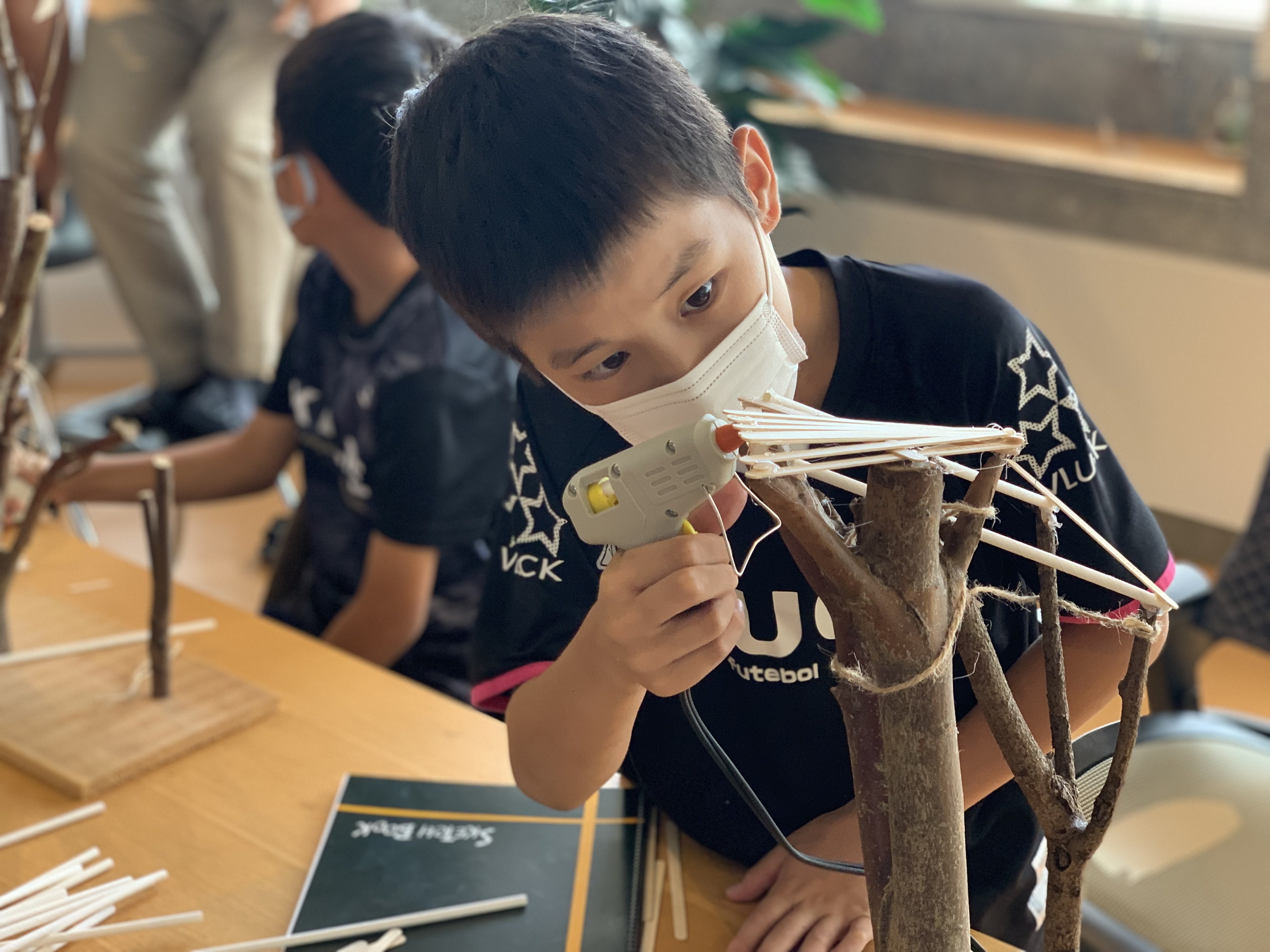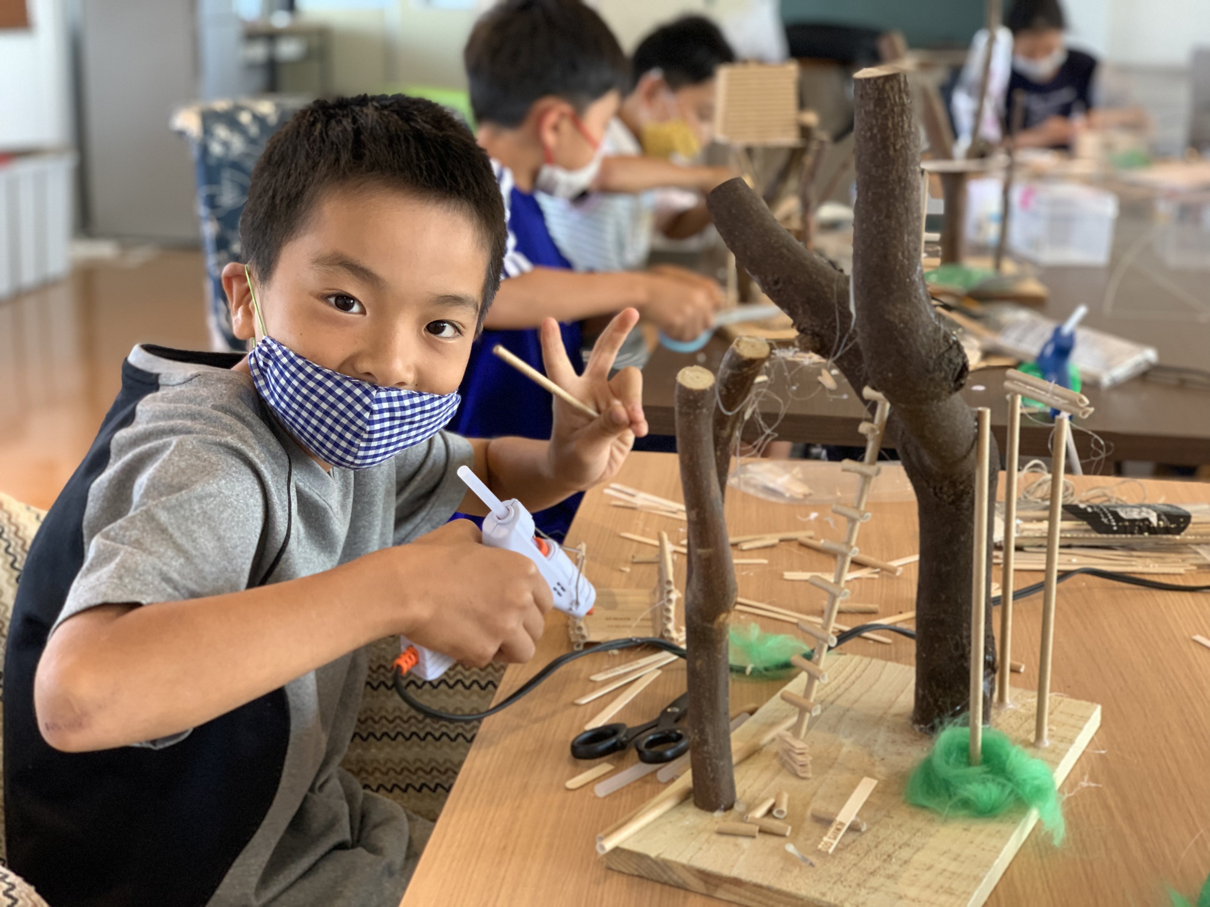 アイスの棒やストローなどをグルーガンや麻紐で固定し、各自理想のツリーハウスを作っていきました。