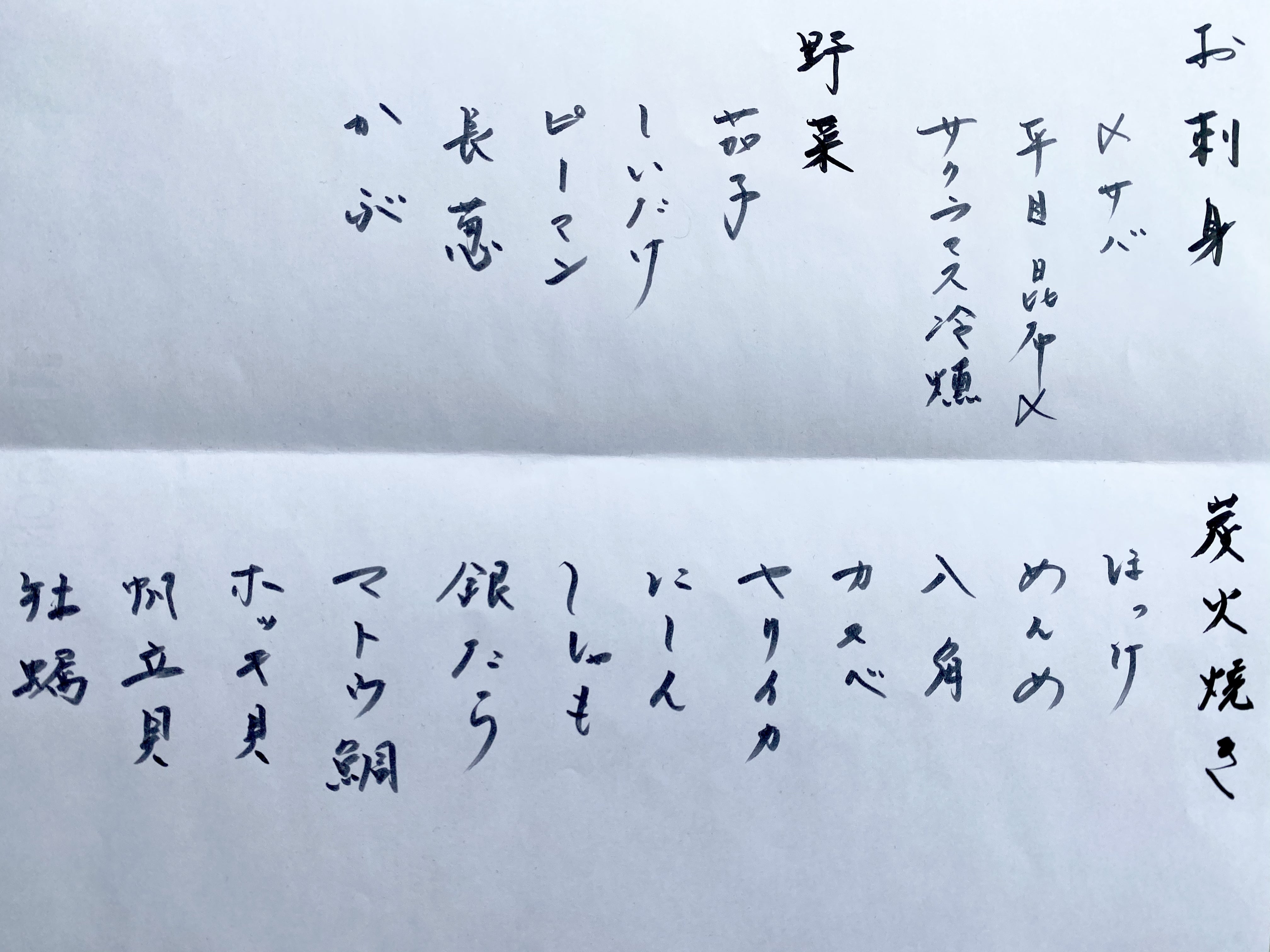 北海道の食材を中心に炉端焼き屋の定番料理は勿論、焼き魚や焼き野菜、釧路の名物料理ザンギや青ツブ焼きはじめ、酒呑みのツボをつく肴、何故かあるワインや生ハムやチーズ。