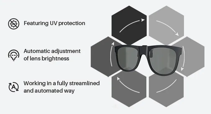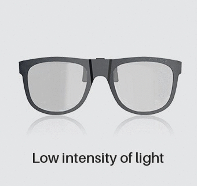 スイッチボタンを押したり、電源を入れる必要もありません。フレームに内蔵されたセンサーがその場の明るさを感知し、レンズの濃淡を自動的に変更します。