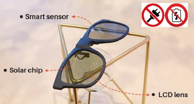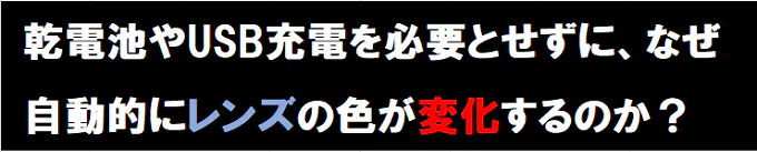 充電も必要としないのに、なぜ自動的にレンズの濃度が変わるのでしょうか?その秘密はフレームの内部にあります。