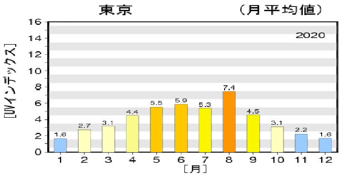 99%UV(紫外線)カットのレンズで目を優しく保護してくれます。以下は気象庁発表の昨年(2020年)の東京の月別紫外線量です。これからの季節8月まで紫外線量が右肩上がりで増していくことが分かります。