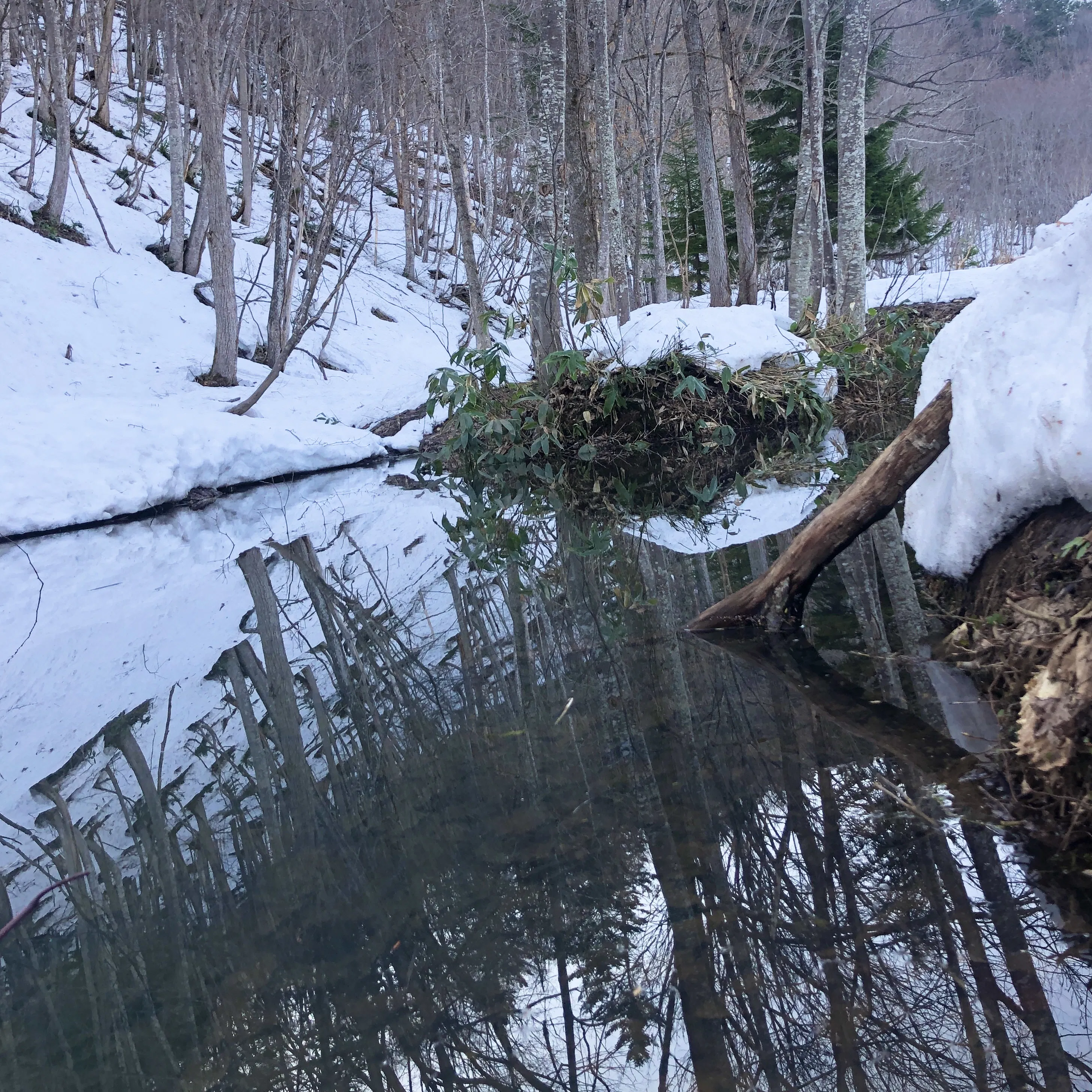 4月に入ってからは、雪解けが進み水路に小さな沢ができています。