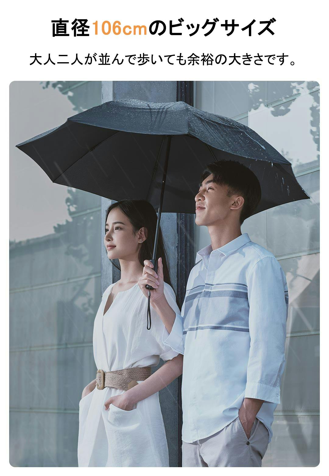 傘の表面が106cmですので、2人で荷物を持って傘に入っても余裕があるほどの大きさです。それに、折り畳み時に、長さは33.2cmのサイズになり、通勤用カバンにすっぽり収納できます。また斜め方向から打ち付ける雨にも濡れにくい仕様となっております。超高密度の撥水加工材料で作られ、雨が珠のように丸くなり転がり落ちます。もう雨の日に濡れる心配はありません。男女老若を問わず、通勤、通学、旅行,出張などの場合がご利用できます。高級感があるシンプルデザイン、ビジネス時からカジュアルな服装にも合わせやすいです。落ち着いたイメージは、男性にぴったりです。