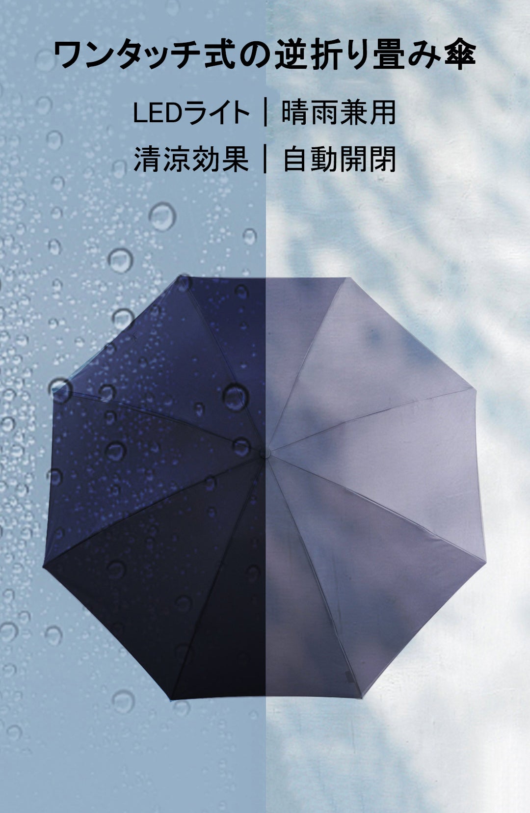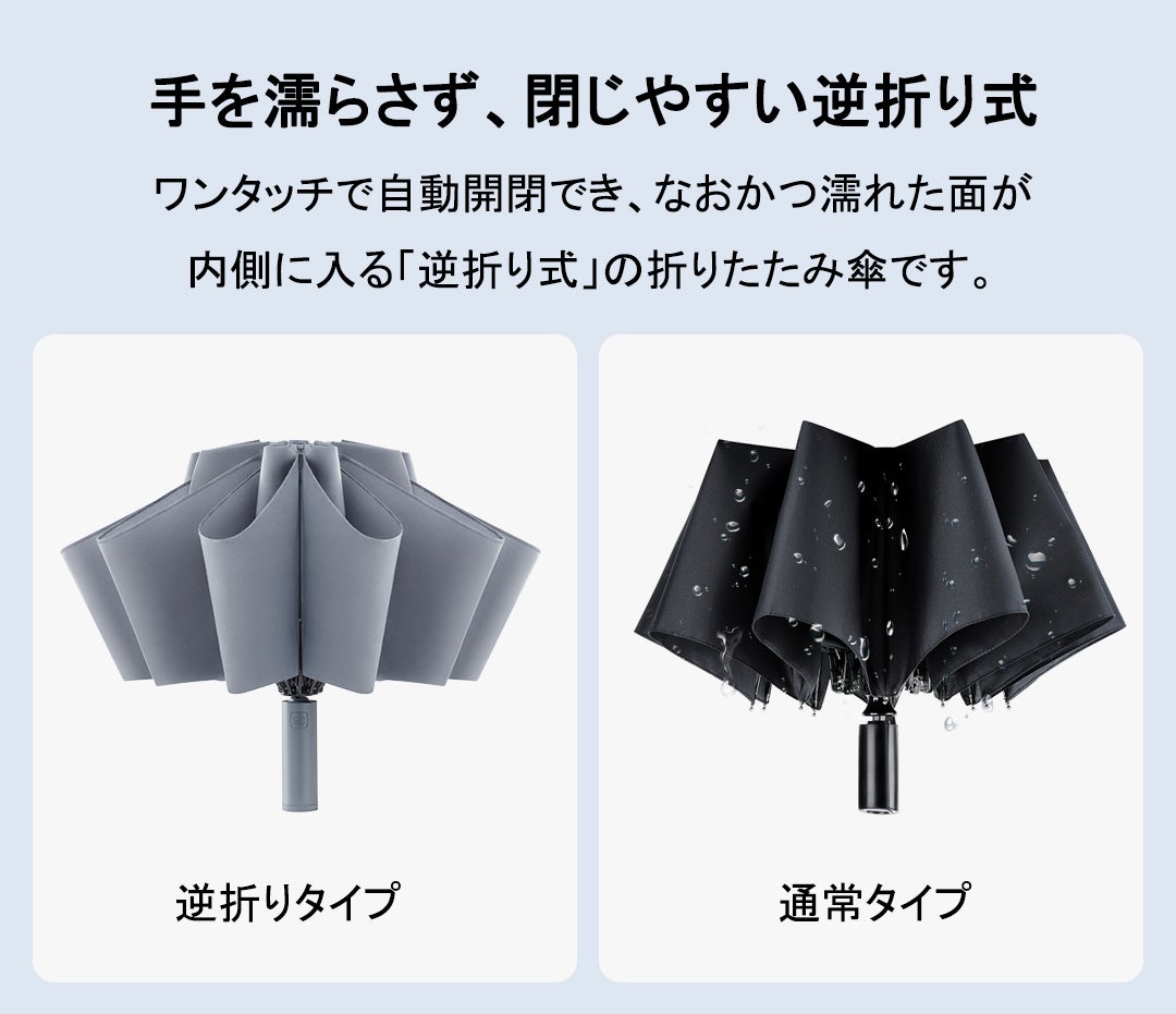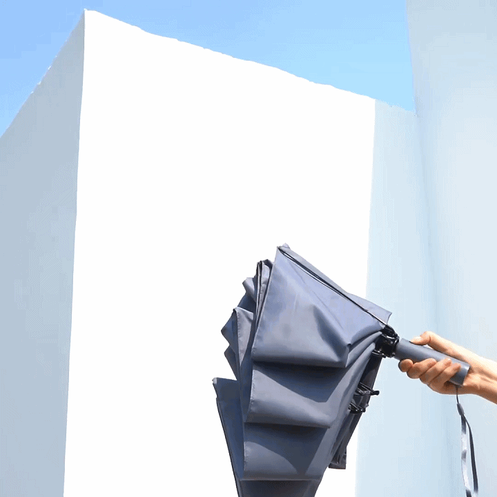 これは逆向きに開閉するようにデザインされ、便利さを一層に進化した折り畳み傘です。雨に濡れた面が傘を閉めたとき内側になるから傘に触れても濡れる心配はありません(乾いている面が外側にあります)。水滴が内側に収納され、洋服や荷物が濡れることなくて周りの人に迷惑をかけることがなくなります。電車で通勤、通学、車の乗り降り、片手に荷物を持っている時にとても便利です。