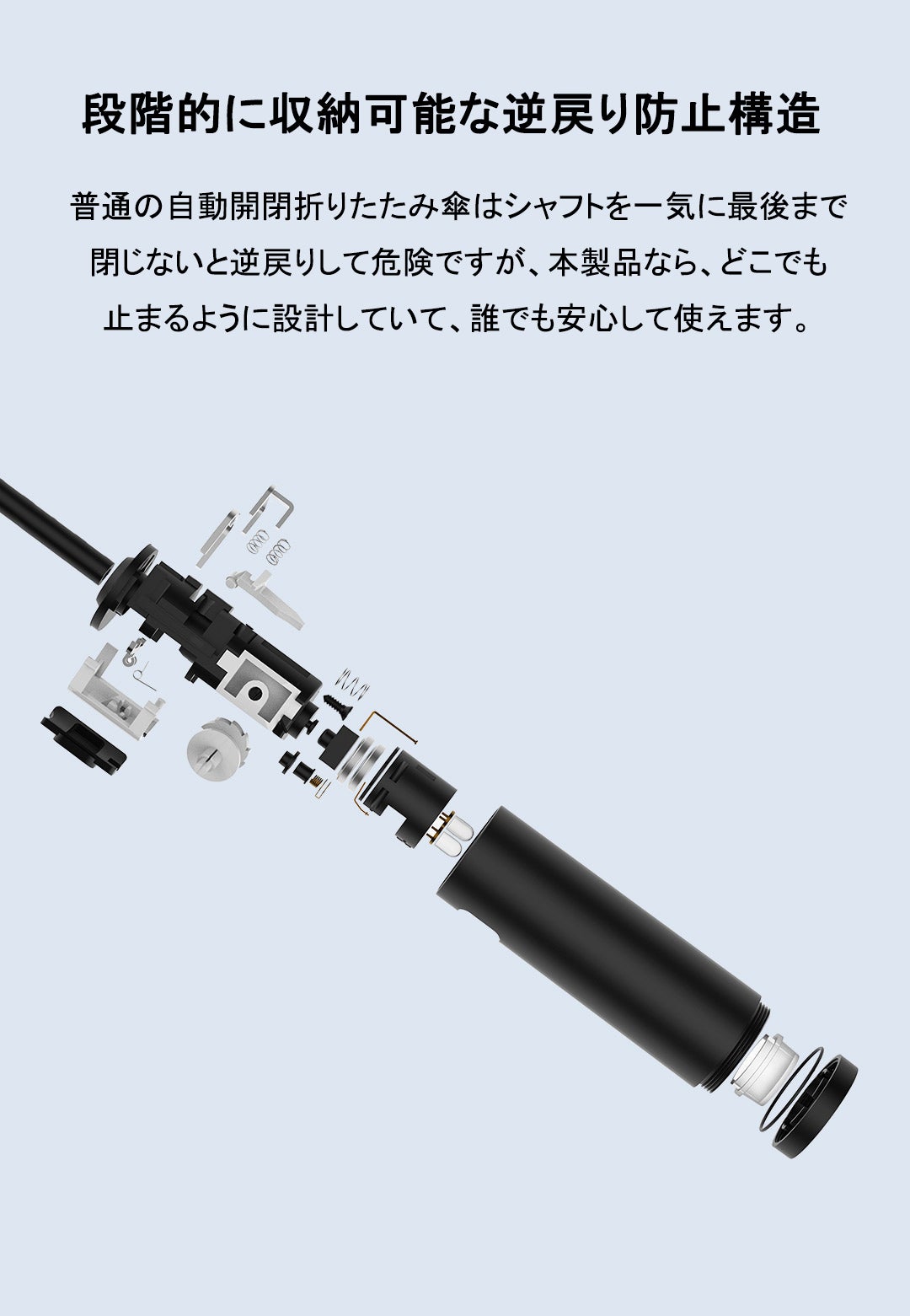 自動開閉機能が備わり、簡単に片手で開閉できます。持ち手についているボタンを押すだけで傘を開いたり閉じたりできますので、車やバスなどの乗り降りの際や、特に荷物の多いときに非常に便利です。出張、旅行へ携帯用など、車に置き傘としてもすごく便利です。