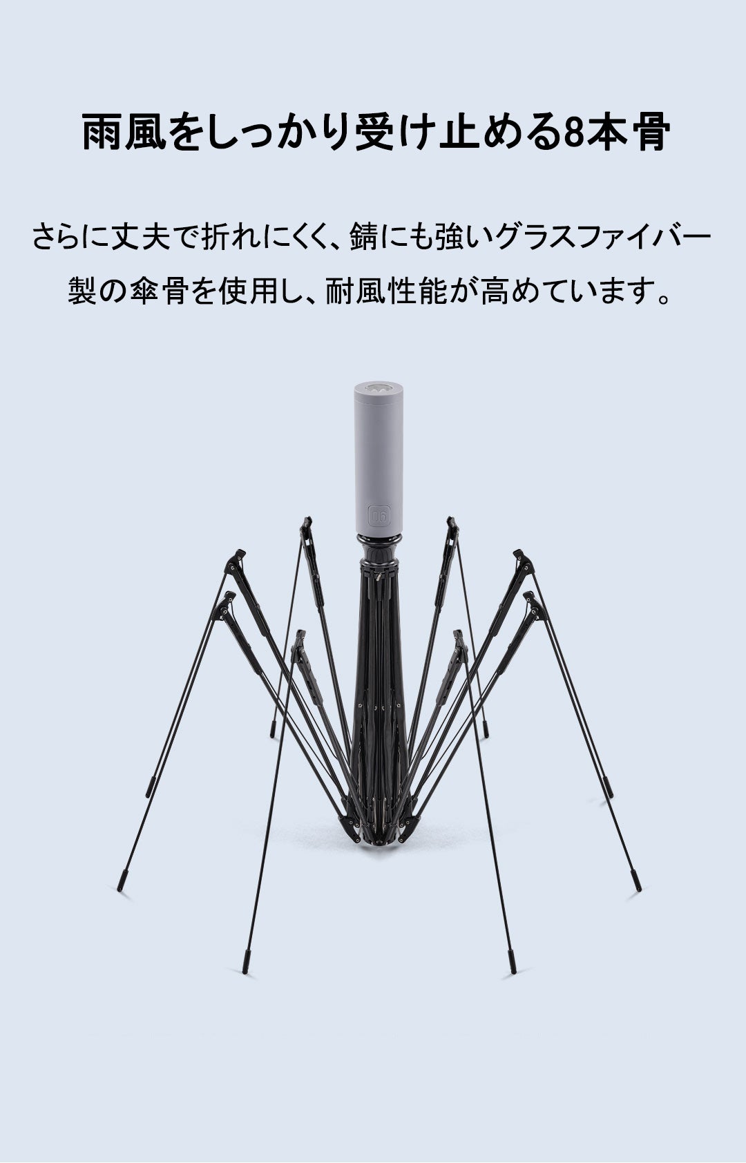 頑丈なガラス繊維素材製傘骨とスステンレス製中棒を採用しており、強風にも耐えられる強度を誇ります。普通な折りたたみ傘より軽くて、固いです。良好な耐風圧性能で、6級の大風を完全に抵抗できます。例え大きい風が吹いているの雨の日に、傘骨曲がることはありません。安心して長時間使用可能です。
