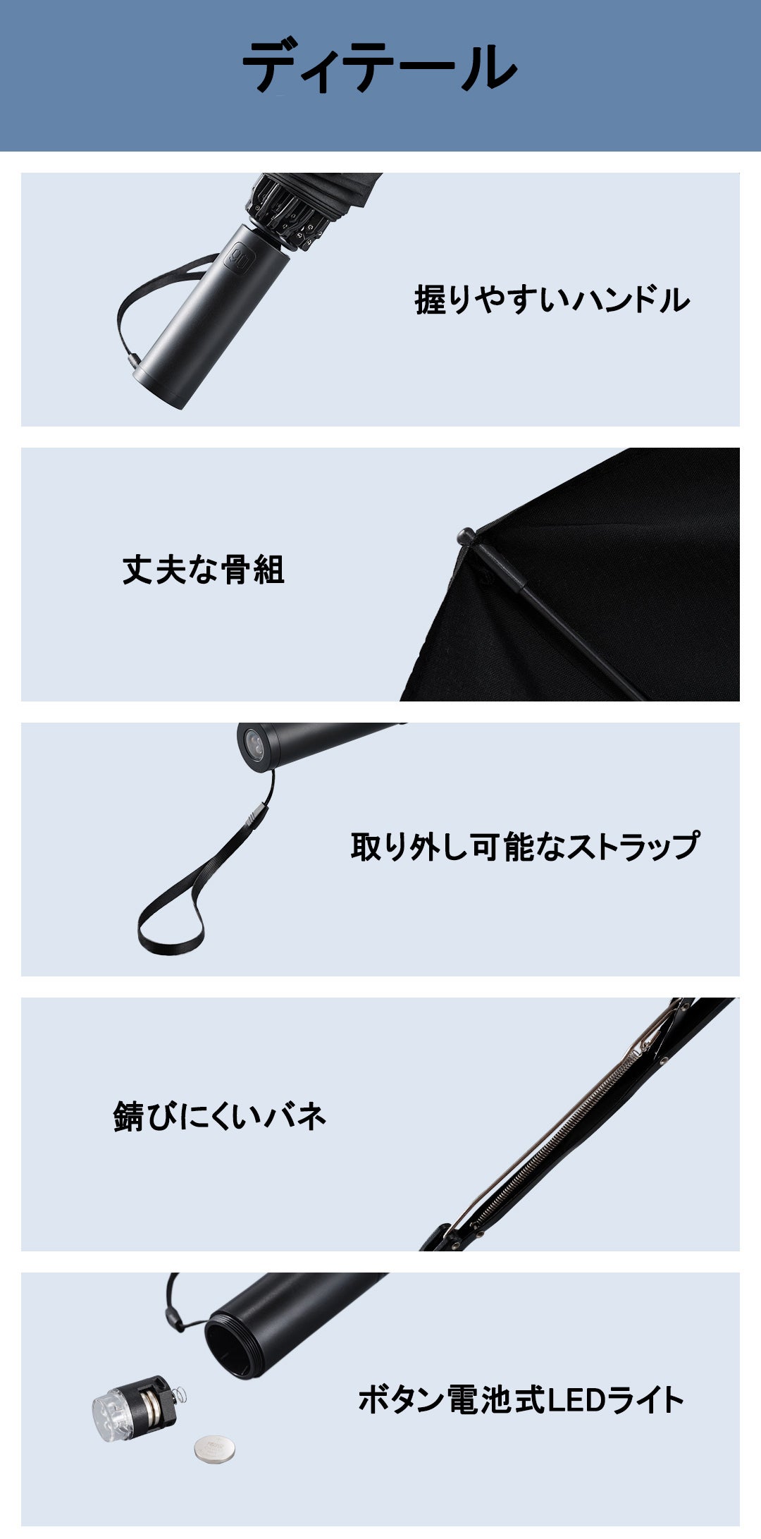 梅雨、夏から秋にかけての台風・秋雨などもあり、雨が多い時期となります。特に夜中、雨の日は外に出るのが暗くて面倒・・・など、そのような悩みを解決するため、LEDライト搭載とファッション性を兼ね備えた「MU」ジメジメした雨の日を快適に乗りきりましょう!