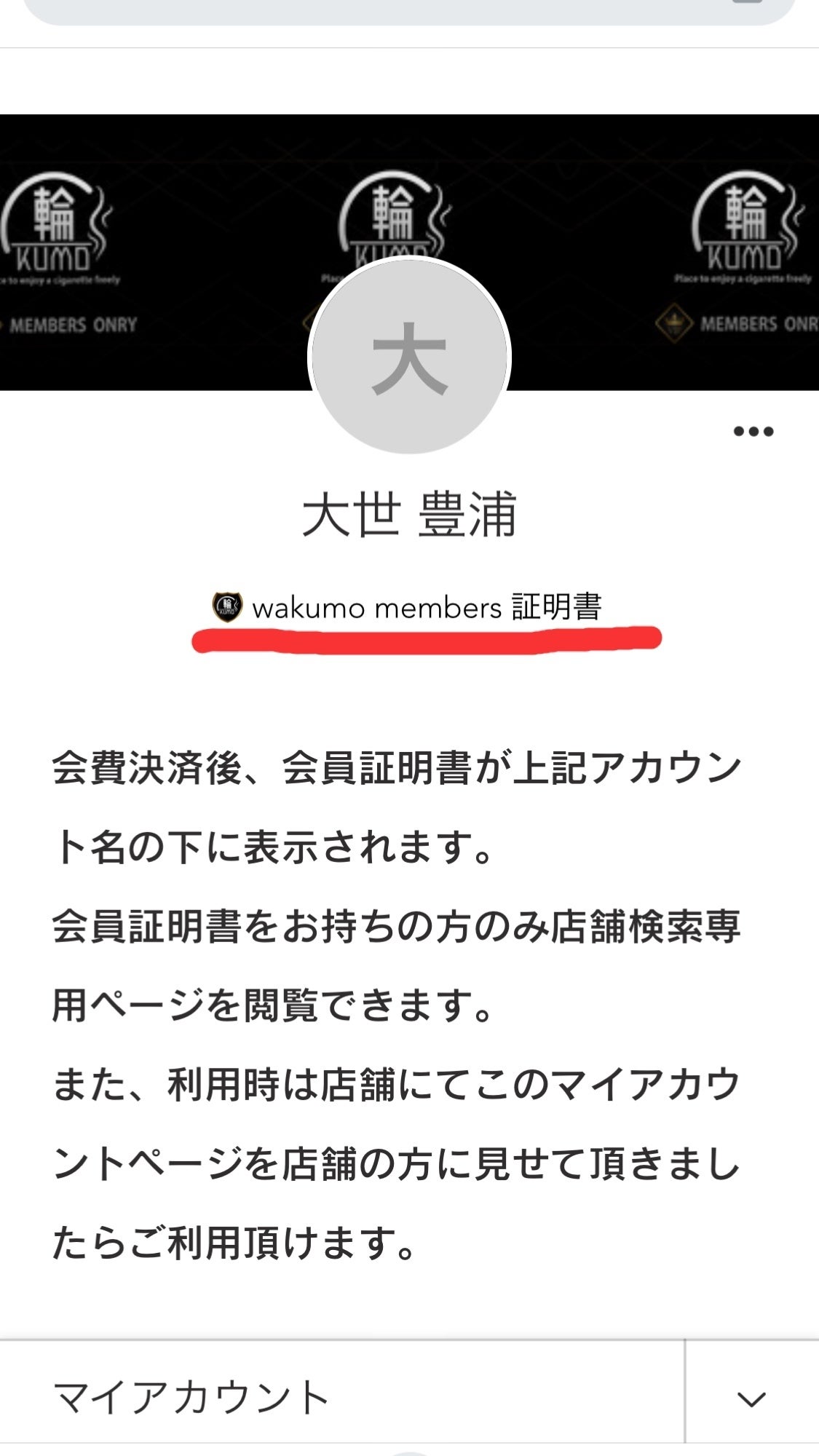 ※お支払いが確認できると、赤下線部分の「wakumo members証明書」が付与されます。