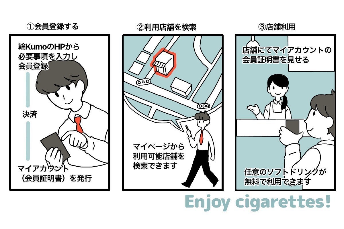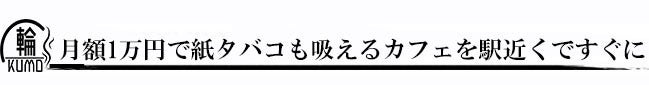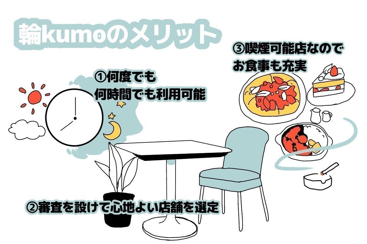 輪KUMOは、月額1万円(税込)で現在地近辺のタバコが吸えるカフェ(全国加盟店)をすぐに検索できます。自宅や会社の近く、出張先など、どこでも利用可能。ソフトドリンク飲み放題になる会員制のサブスクリプションサービスとなります。