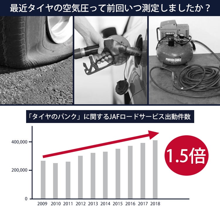 ここ10年で車のトラブル件数は減っていますが、パンクなどのタイヤのトラブルは増えています。もしタイヤがパンクしてロードサービスを呼ぶことになったら、時間も手間もかかりせっかくの一日が台無しに...タイヤの空気圧は本来1か月に1回チェックするのが良いとされています。